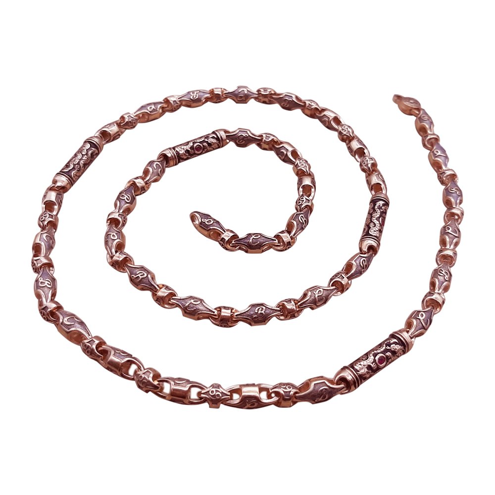 Unikatowy łańcuszek w kolorze czerwonego złota z inicjałami klienta i smoczymi wstawkami. Wszystkie ogniwa są czernione, a smocze wstawki wysadzane są kamieniami o przybliżonej średnicy 3 mm. Wzór może zostać zmieniony na życzenie klienta. Waga jest podana w stosunku do rozmiaru.
