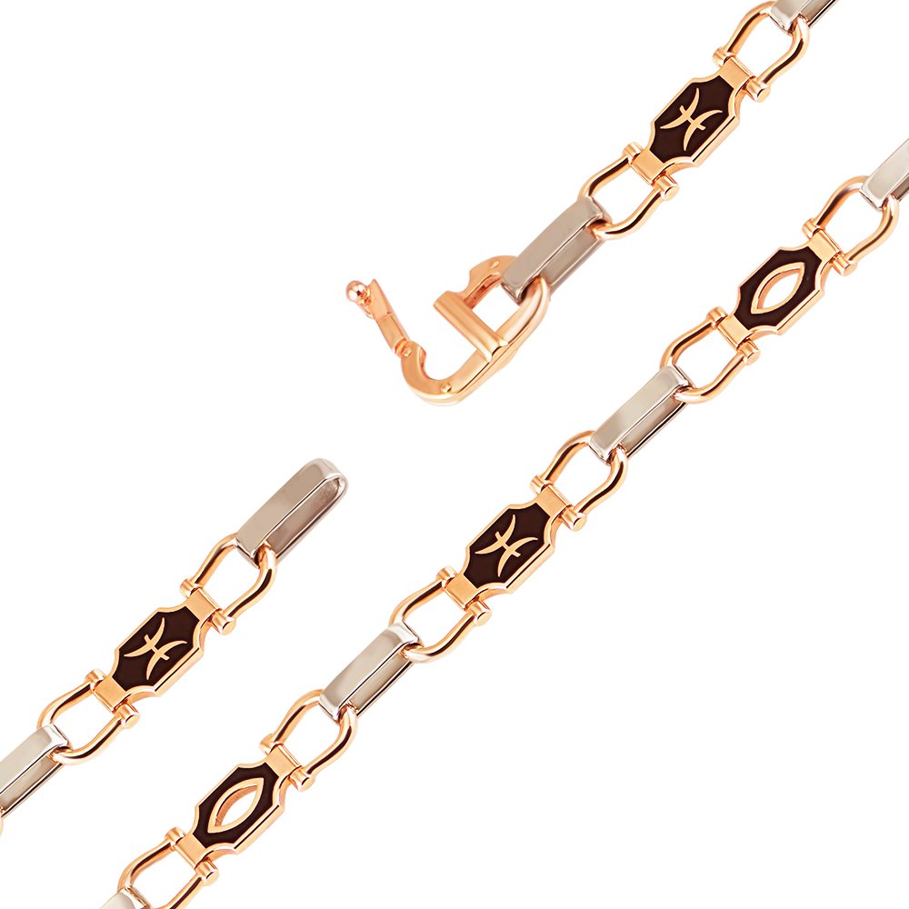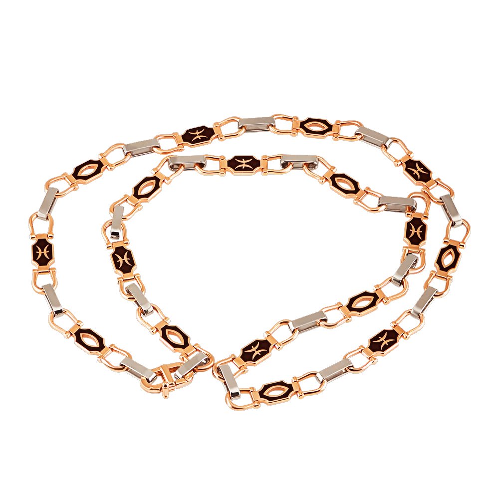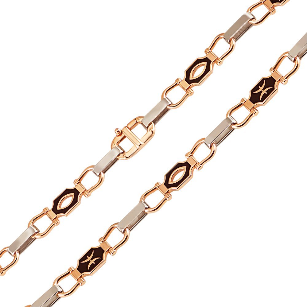 Wyjątkowy łańcuszek w połączeniu białego i czerwonego złota. Ogniwa z czerwonego złota mają wzory pokryte czarną emalią, a białe ogniwa są rodowane. Zapięcie to latający karabińczyk. Wzór może zostać zmieniony zgodnie z życzeniem klienta. Waga zależy od zmiany rozmiaru.