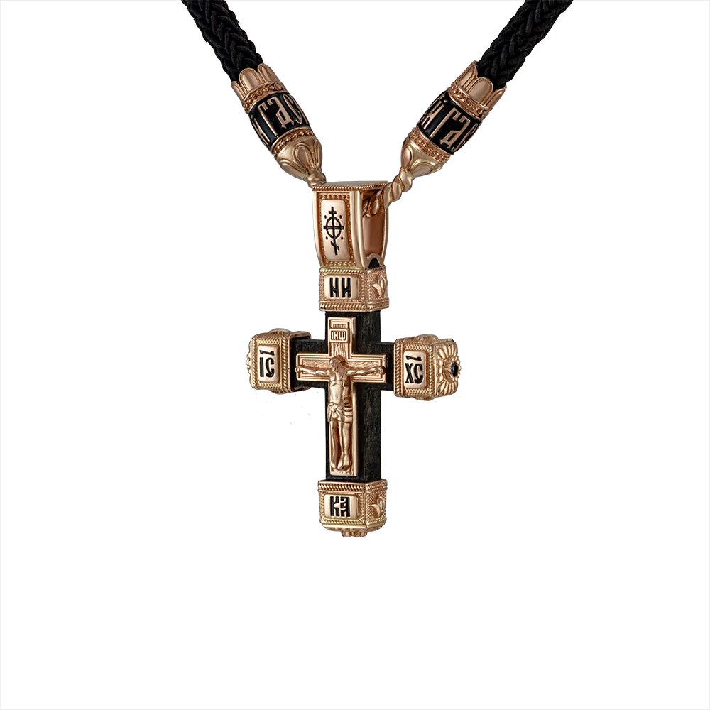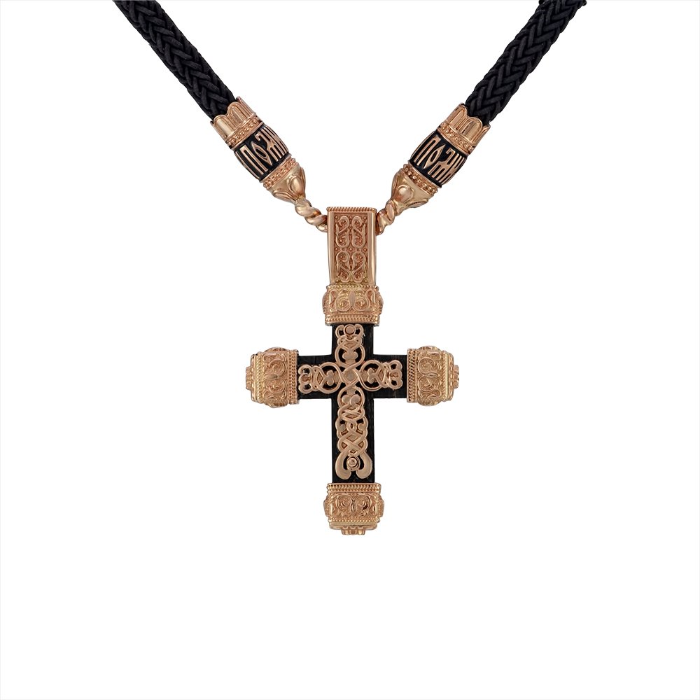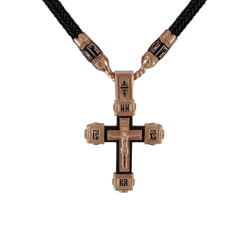 Krzyż na hebanie, z inkrustacjami z czerwonego złota. Waga zależy od wymiarów biżuterii, przy wysokości około 45 mm z uszkiem i szerokości 25 mm waży 10,03 grama. Na przedniej stronie znajduje się krucyfiks i wstawki pokryte czarną emalią. Na uszku z przodu znajduje się symbol pokryty czarną emalią, a z tyłu wzory. Wzór i wymiary mogą zostać zmienione zgodnie z życzeniem klienta..