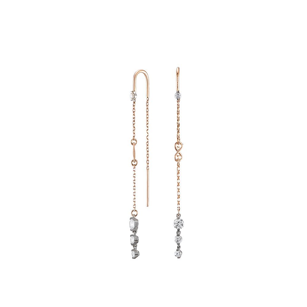 Kolczyki – brosze z połączenia czerwonego i białego złota, o wadze 4,65 grama. Baza z czerwonego złota, odlewy z białego złota platerowane rodem. Na kolczykach osadzone kamienie o średnicy 4,00mm; 3,00mm; 2,50mm, 2,30mm, na życzenie klienta można osadzić dowolne kamienie. Wysokość łuku 1cm, całkowita długość tylnego łańcuszka od łuku 5cm, całkowita długość przedniego łańcuszka z kamieniami od łuku 6,5cm.
