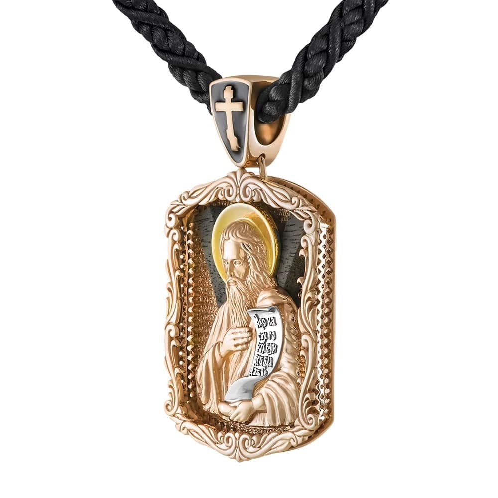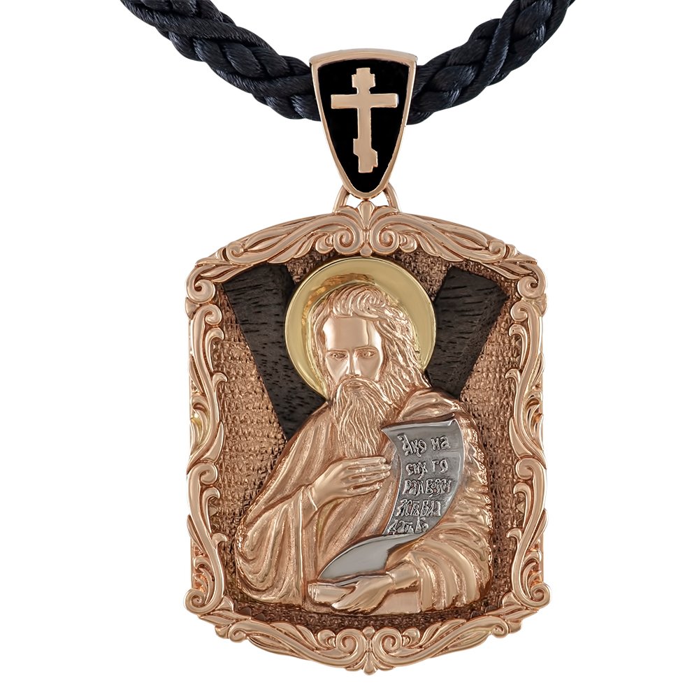 Ikona z czerwonym złotem, z drewnianą wkładką, waga zależna od wymiarów, przy wysokości ikony 50mm bez ucha, waga 48,20 grama. Z przodu wizerunek Andrzeja, zwój pokryty rodem, z tyłu napis "Save and Preserve".Ikona z czerwonym złotem, z drewnianą wkładką, napis "Save and Preserve".