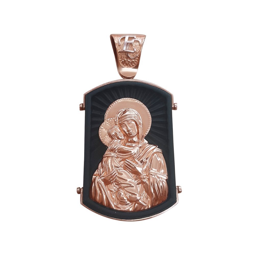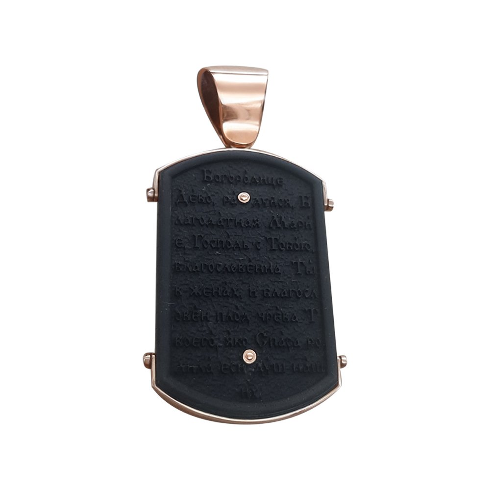 Ikona na drewnie, w kolorze czerwonego złota, boczne wsporniki i inicjały z białego złota próby 585*. Waga złota w ikonie wynosi 9,76 grama. Z tyłu ikony na drewnie znajduje się modlitwa "Bogurodzica Dziewica". Wysokość ikony bez uszka wynosi 43 mm.