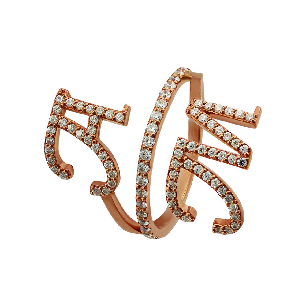 Unikatowy pierścionek z inicjałami według życzenia klienta. Pierścionek z czerwonego złota z literami. W pierścionku osadzone są kamienie o średnicach 1,00mm; 1,25mm. Waga zależy od zmiany rozmiaru, przy rozmiarze 16 waga złota w biżuterii wynosi 2,48. Wzór i wymiary mogą zostać zmienione zgodnie z życzeniem klienta..
