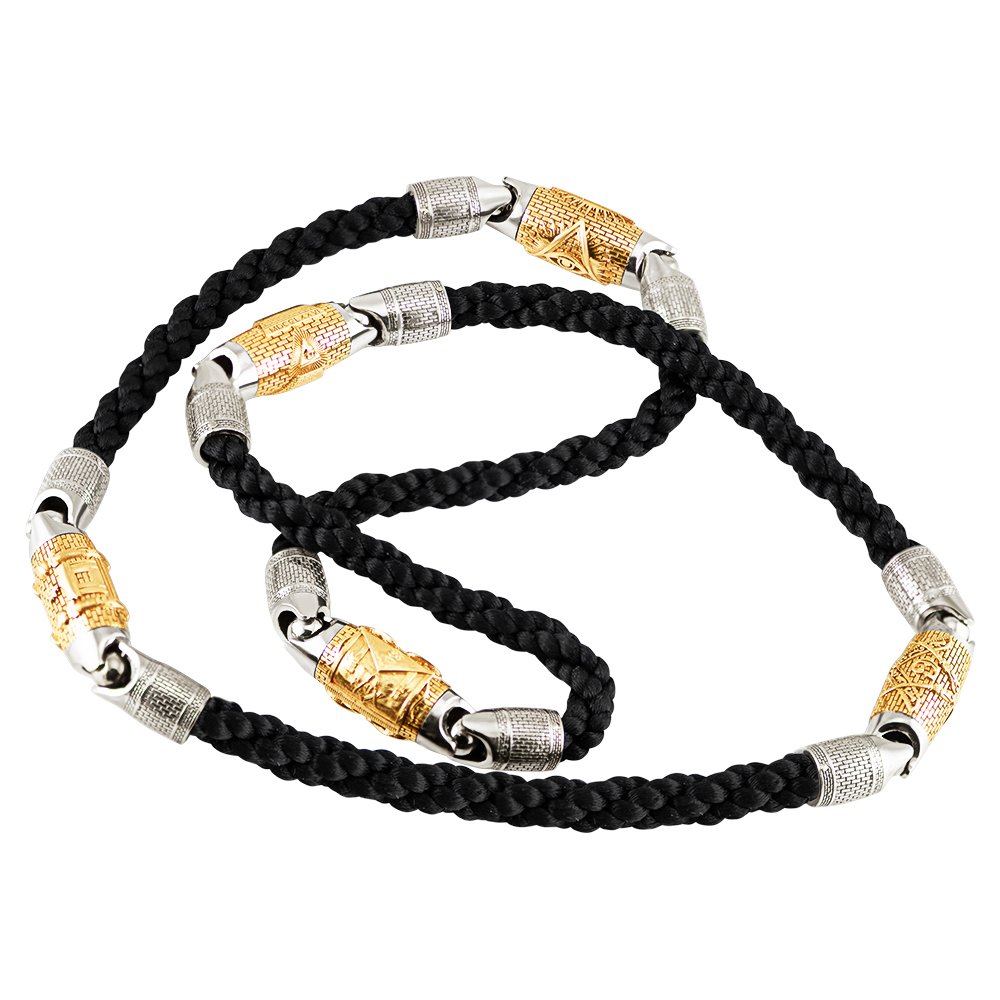 Lina w kolorze białego i cytrynowego złota. Waga złota w sznurze to 69,55 grama, średnica sznura to 6mm. Wkładki w środku przedstawiają symbole masońskie i mają mechanizm obrotowy. Białe wkładki końcowe mają rodowany wzór ceglanego muru.