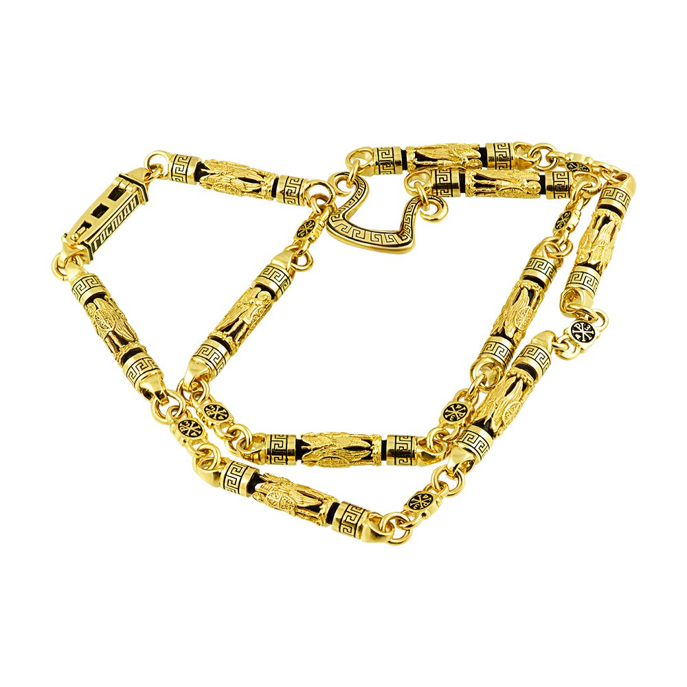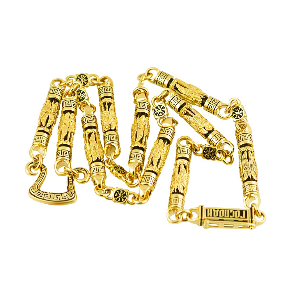 Wyjątkowy łańcuszek w kolorze cytrynowego złota z drewnianymi wstawkami. Wstawki przedstawiają twarze Anioła Stróża, również na wstawkach wymodelowany jest wzór greckiej nieskończoności. Na ogniwach łączących przedstawiona jest chrisma, zamek – pudełko, z jednym zamkiem, z napisem " Panie, zachowaj i zachowaj". Części łańcuszka pokryte są czarną emalią. Po dplgiej stronie łańcuszka znajduje się pręt w kształcie podkowy, na którym przedstawiono grecką nieskończoność. Wzór może zostać zmieniony zgodnie z życzeniem klienta. Waga jest zależna od rozmiapl.