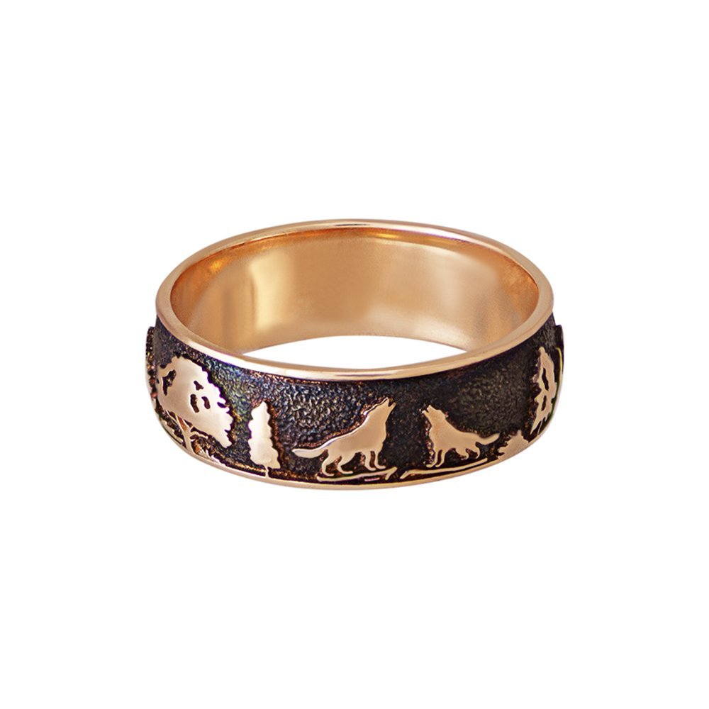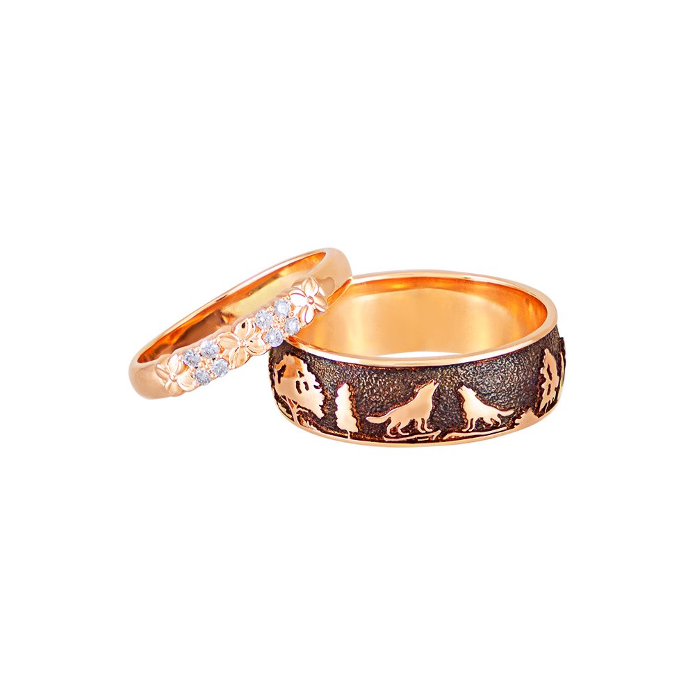 Pierścionki zaręczynowe w kolorze czerwonego złota. Waga pierścionków różni się w zależności od rozmiaru. Na przedniej stronie męskiego pierścionka znajdują się dwa wilki i drzewa, również podstawa pokryta jest niello. Na damskiej obrączce znajdują się ułożone kwiaty, z wkomponowanymi diamentami. Średnica kamieni 1,5 mm (8 sztuk). Kamienie mogą być osadzone dowolnie, na życzenie klienta.