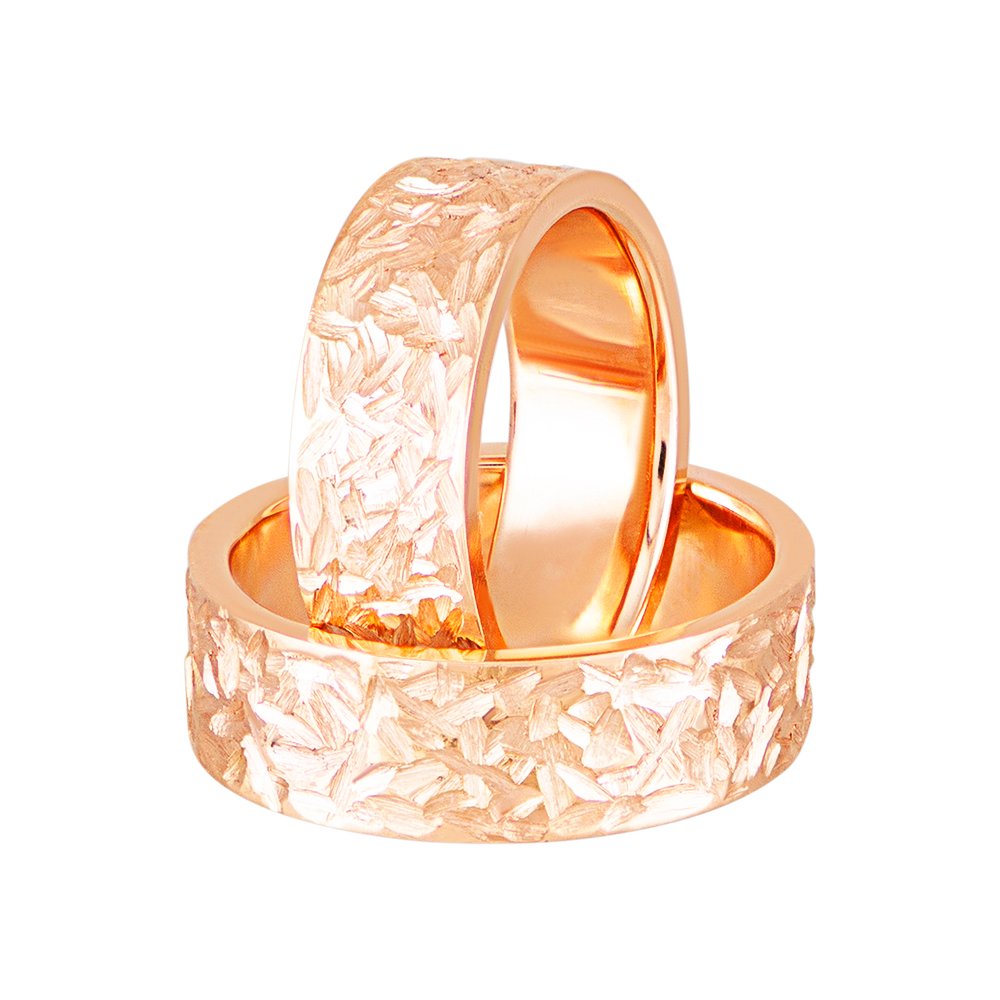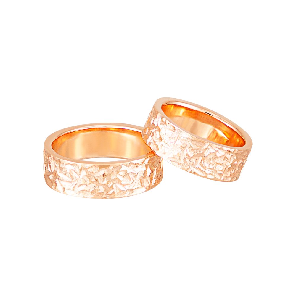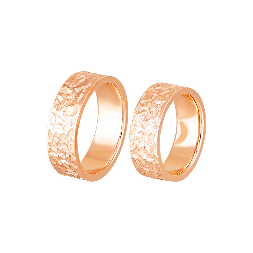 Obrączki ślubne z czerwonego złota. Waga różni się w zależności od rozmiaru. Obrączki mają 7 mm szerokości i 1,8 mm grubości. Wzór obrączek jest matowany.