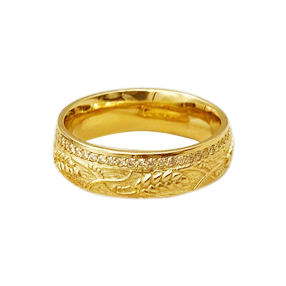 Obrączka z cytrynowego złota próby 585*, szerokość obrączki 13mm. Na jednej krawędzi brylanty około 2mm, w ilości 27 sztuk, oraz 2 szafiry w kolorze żółtym i niebieskim, średnica 2mm. W obrączce damskiej szafiry znajdują się pomiędzy brylantami, wyśrodkowane wzdłuż wzorów kolców. Pierścionek męski ma pośrodku wzór kłosów, a po jednej stronie 2 szafiry, okrągłe, niebieskie i żółte, o średnicy 2 mm.