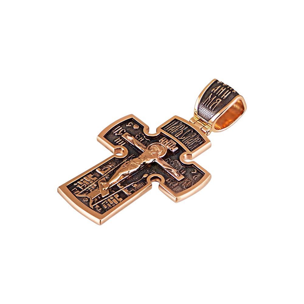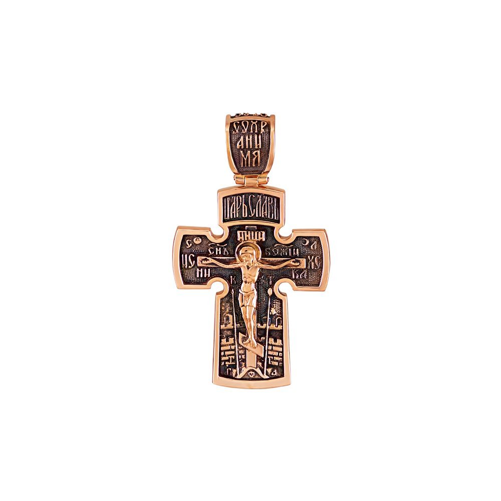 Cross in red gold with niello. The weight of the jewelry depends on the dimensions, with the total height of the jewelry 45mm weight of gold 14.80 grams. On the front side there is a crucifix, and on the back side there is an image of Archangel Michael.