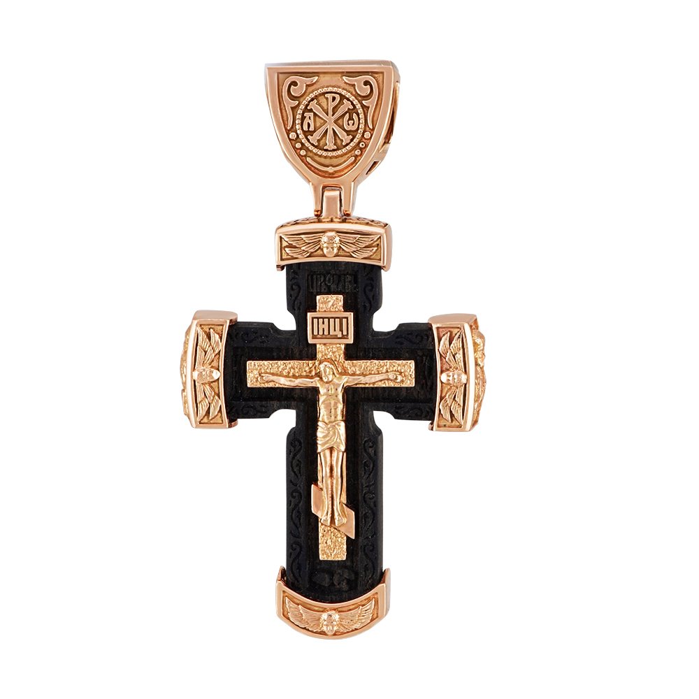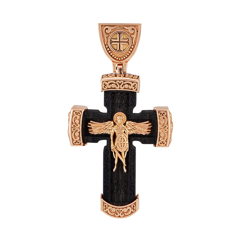 Cross on Eben wood, red gold, weighing 19.23 grams, at a height of 50mm without an ear. On the front side is the crucifixion, on the back side in the center is the Archangel Michael, on the sides are images of saints. On the ear on both sides are patterns. The side inserts have angels on the front side and patterns on the back side.