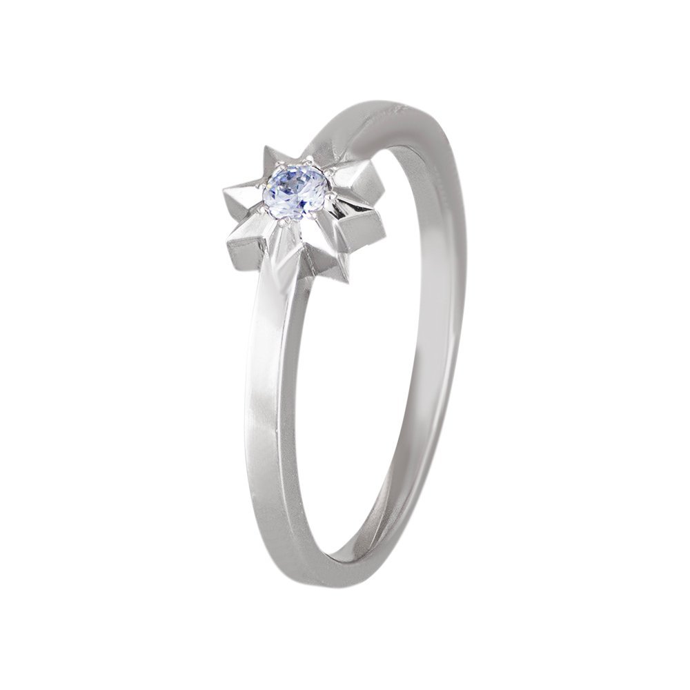 Rhodium plated ring in white gold. The weight of gold in the ring is 3.50 grams, the weight may vary depending on the size. Cast in the form of a star, inset diamond with a diameter of 3 mm. Ring size 17.5.