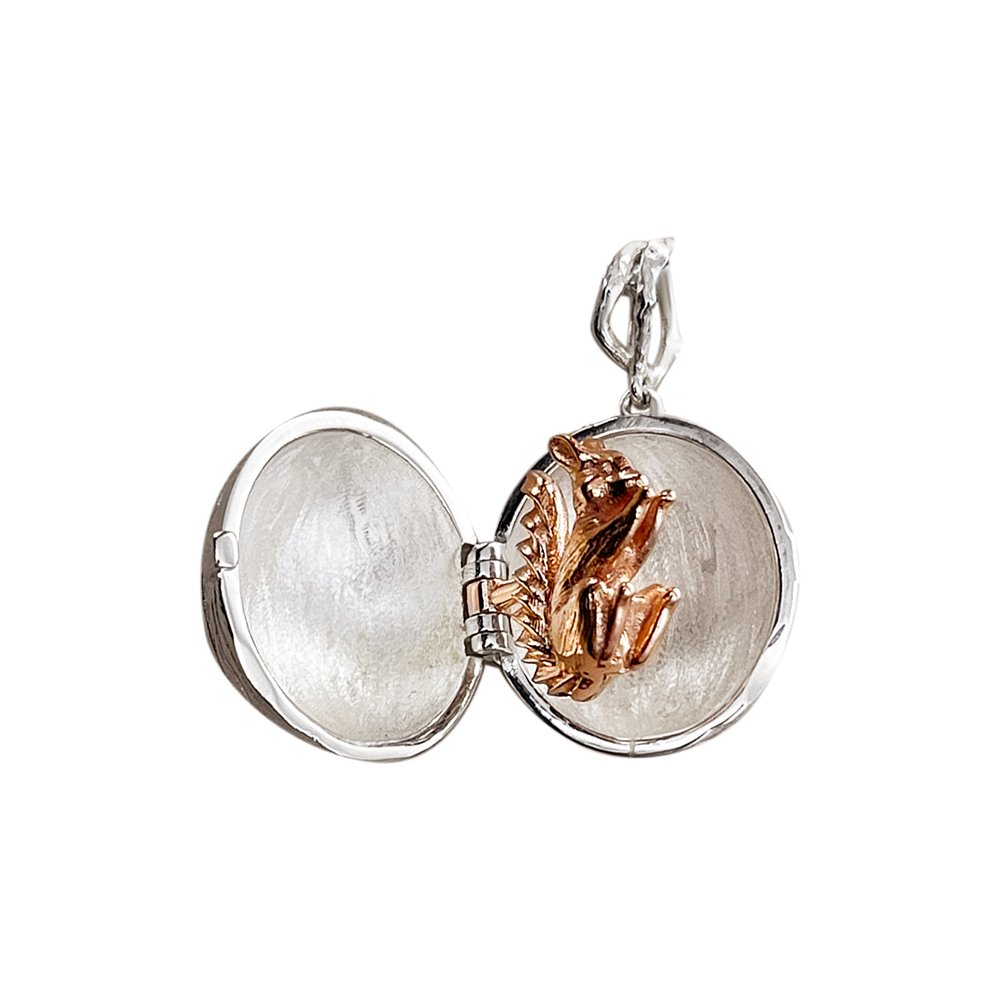 Pendant in white and red 585* gold color. Squirrel in red gold, rhodium plated white gold base.  The case in the form of a nut opens. The height of the pendant in the ear is 28mm.