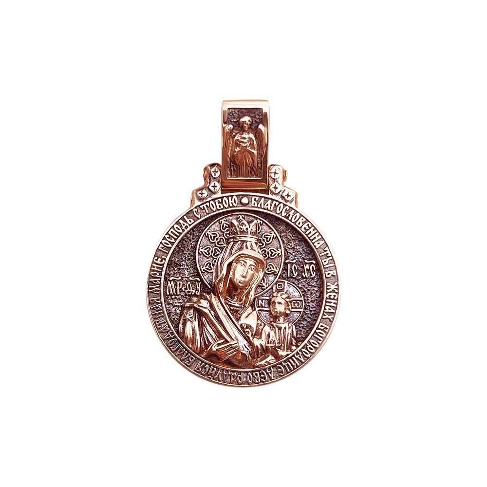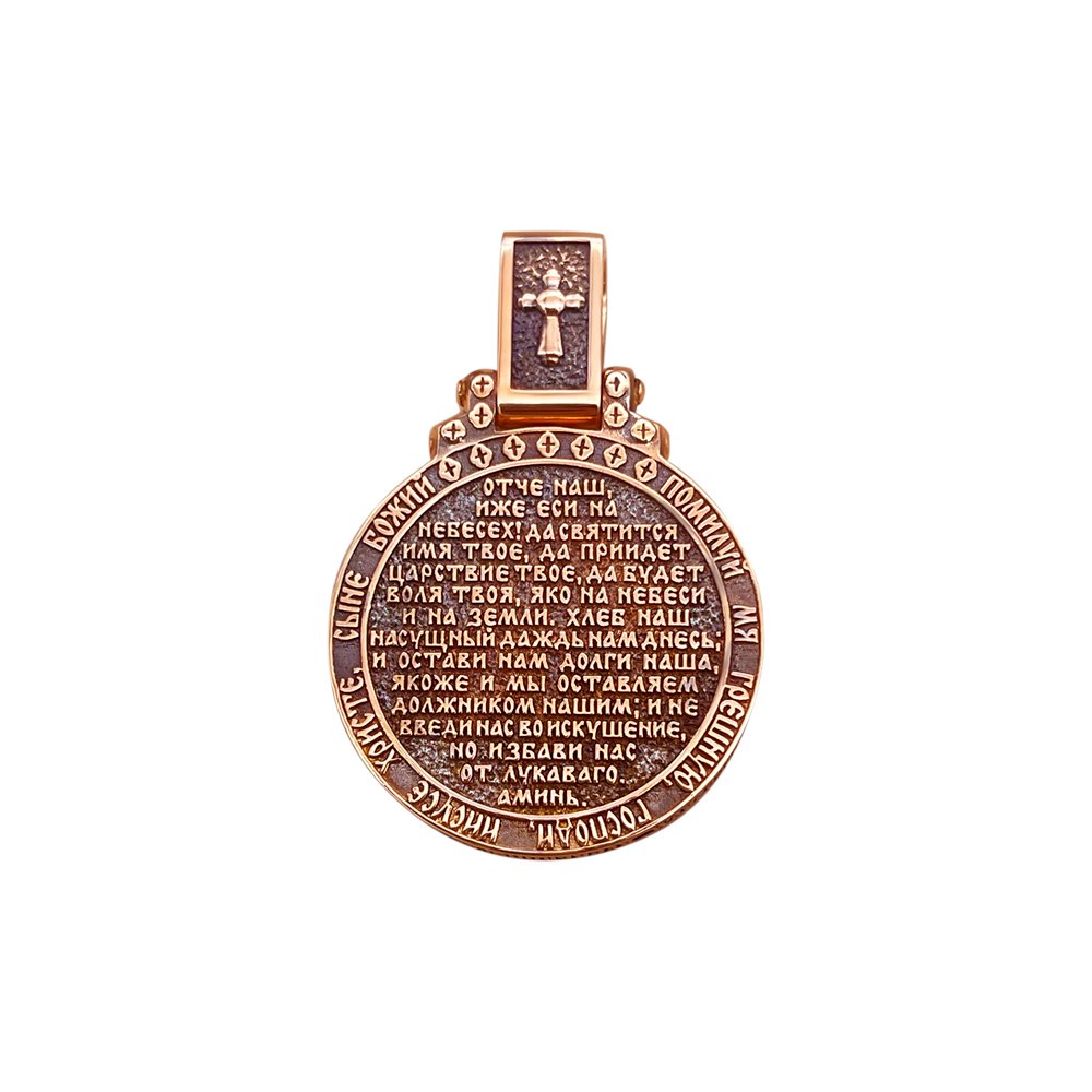Icon in red color of gold 585*,all gold 26.23 grams. The diameter of the icon is 30mm. On the front side is the face of the Virgin Mary, on the back side is the prayer “Our Father”, around the prayer is the inscription: “Polimuy me sinful, Lord, Jesus Christ, Son of God” and symbols. On the ear on the front side of the face of the Guardian Angel, with the reverse symbol of the cross. Icon covered with niello.