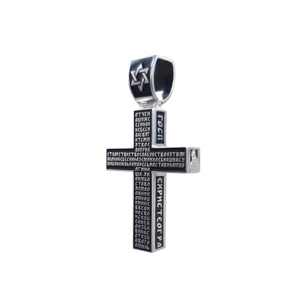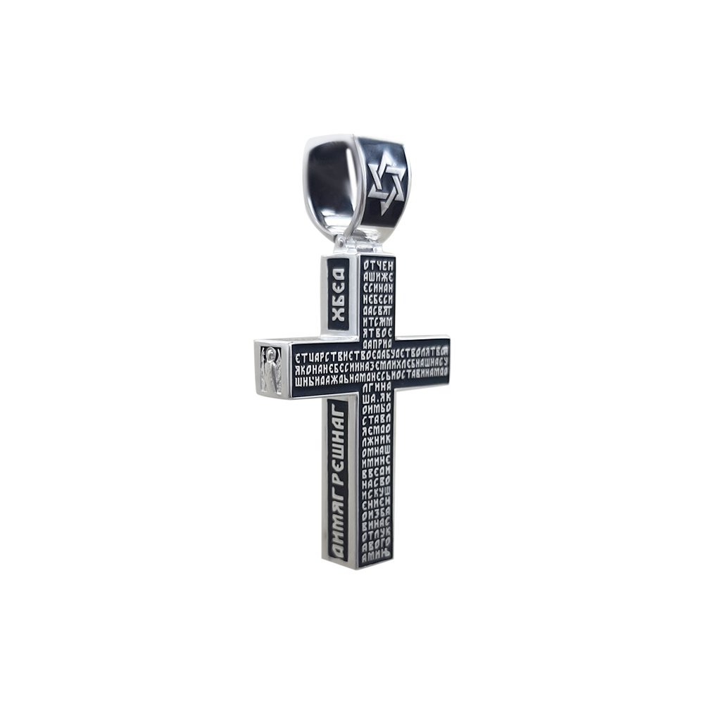 Cross in white gold, crucifix in 585* lemon gold. The weight of gold in the cross is 24.32 grams. The rim on the front side, on the end, the ear and the back side is covered with black enamel. On the back side of the prayer “Our Father”. On the end of the cross depicts two faces of the Mother of God and the Guardian Angel, as well as the text “Protect me Lord from all sorts of troubles). On the lug on the front side of the face of Jesus, on the reverse side of the Star of David. On the front side set diamonds, diameter 2.5mm. The cross is covered with rhodium.
