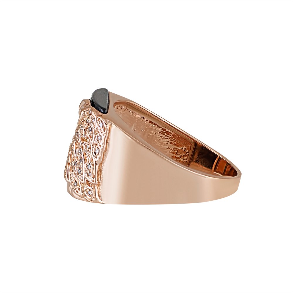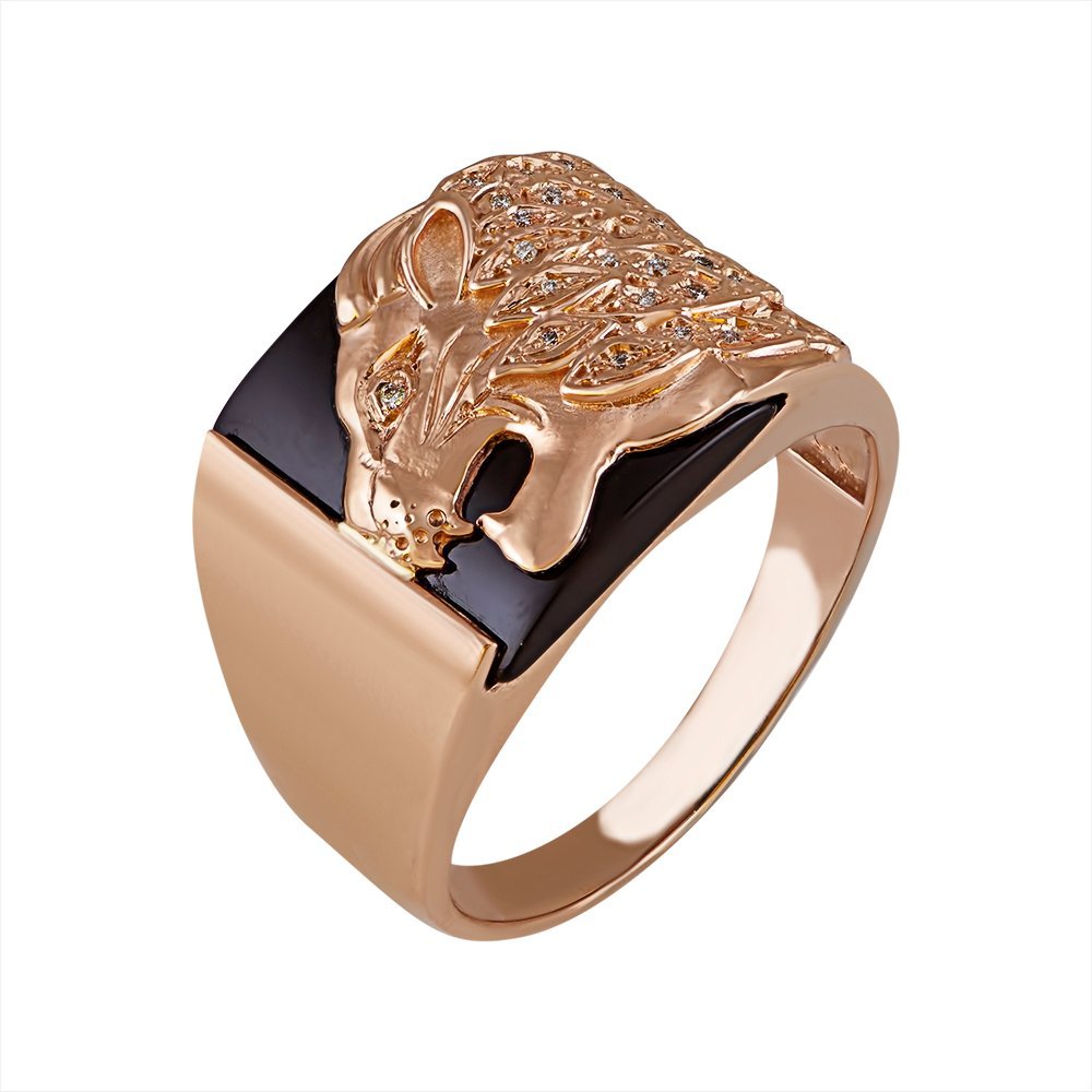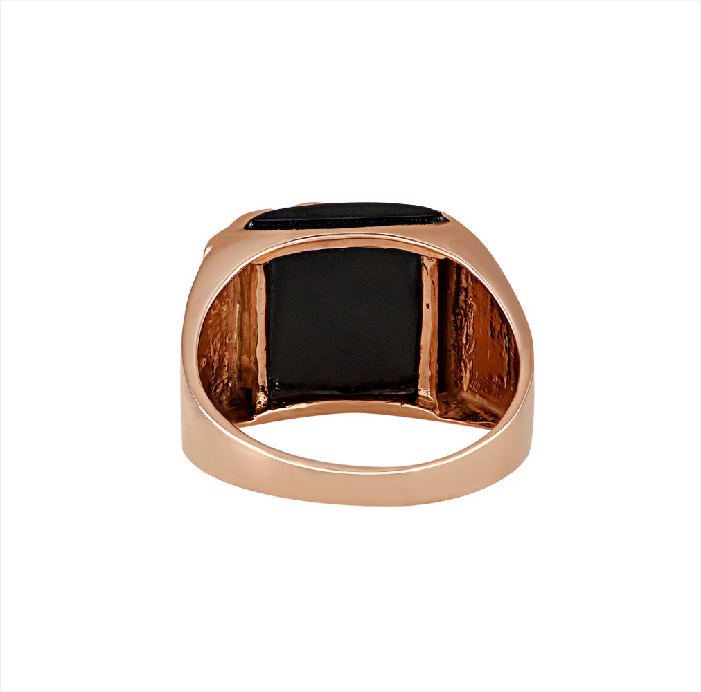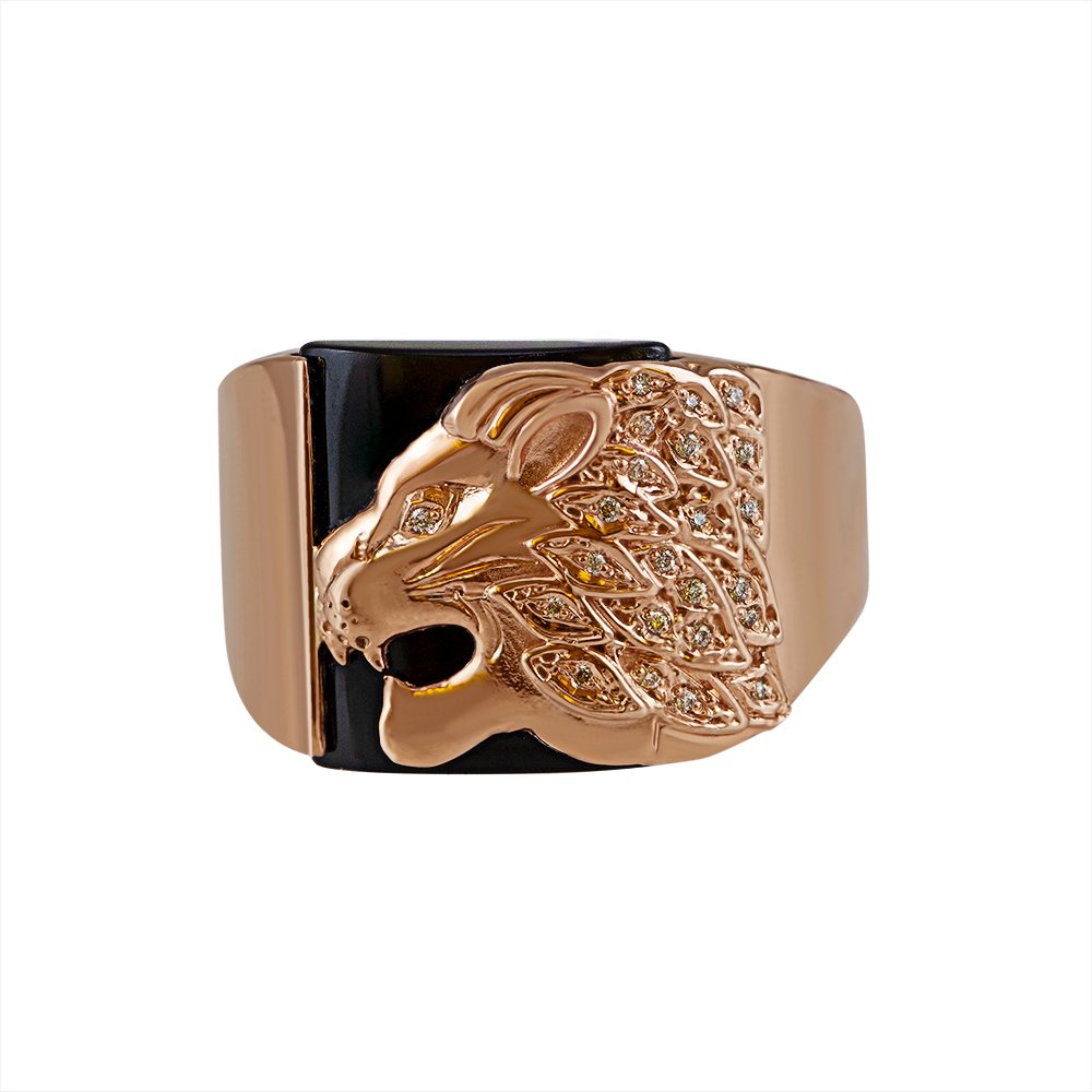 Men’s ring in red gold, and with onyx inlay in the center. The weight varies according to the size. In the center of the front part of the image of a lion, on the eyes and mane inserts stones, diameter 1.00mm. It is possible to install any stones at the customer’s request.