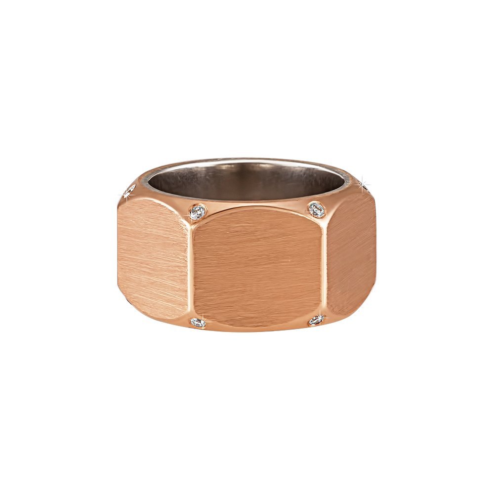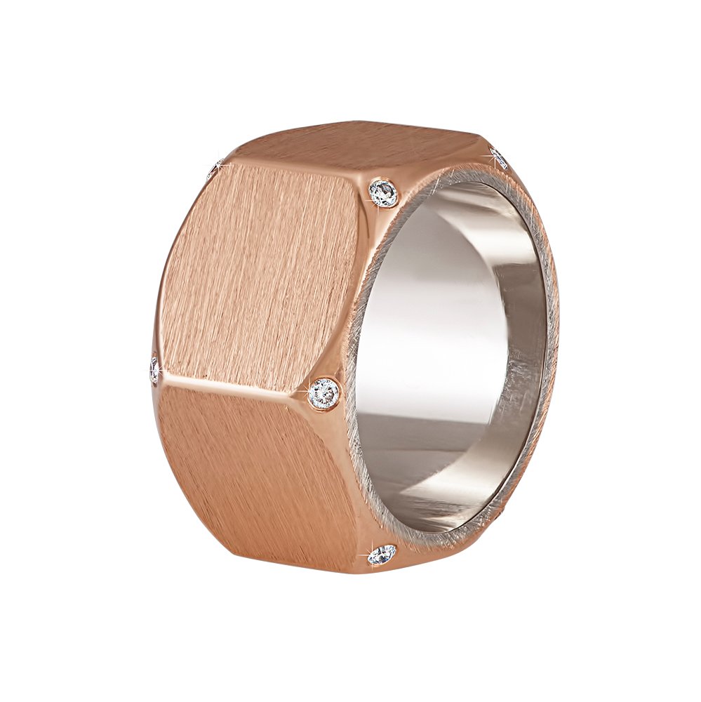 Original men’s ring in a combination of white and red gold color, the shape of a nut. On the front side the surface is matted, on the ends are set stones with a diameter of approximately 1.5 mm, the inner part is made of white gold, which is plated with rhodium. The weight changes in relation to the size.  The design can be changed at the customer’s request.