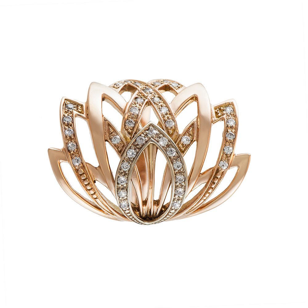 Ring in red gold and one element in white gold, plated with rolyem. Inserts Swarovski stones (stones can be put any at your request), diameter 1.25mm (25 pcs) . Weight depends on the size of the jewelry. At the size 17 the weight of gold in the ring is 6.12 grams.