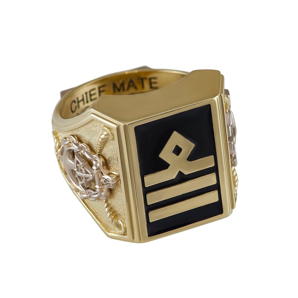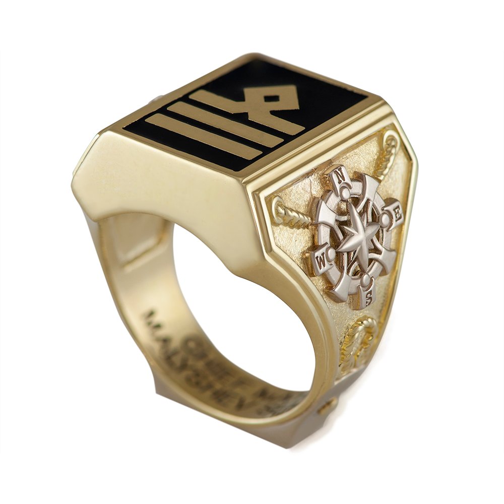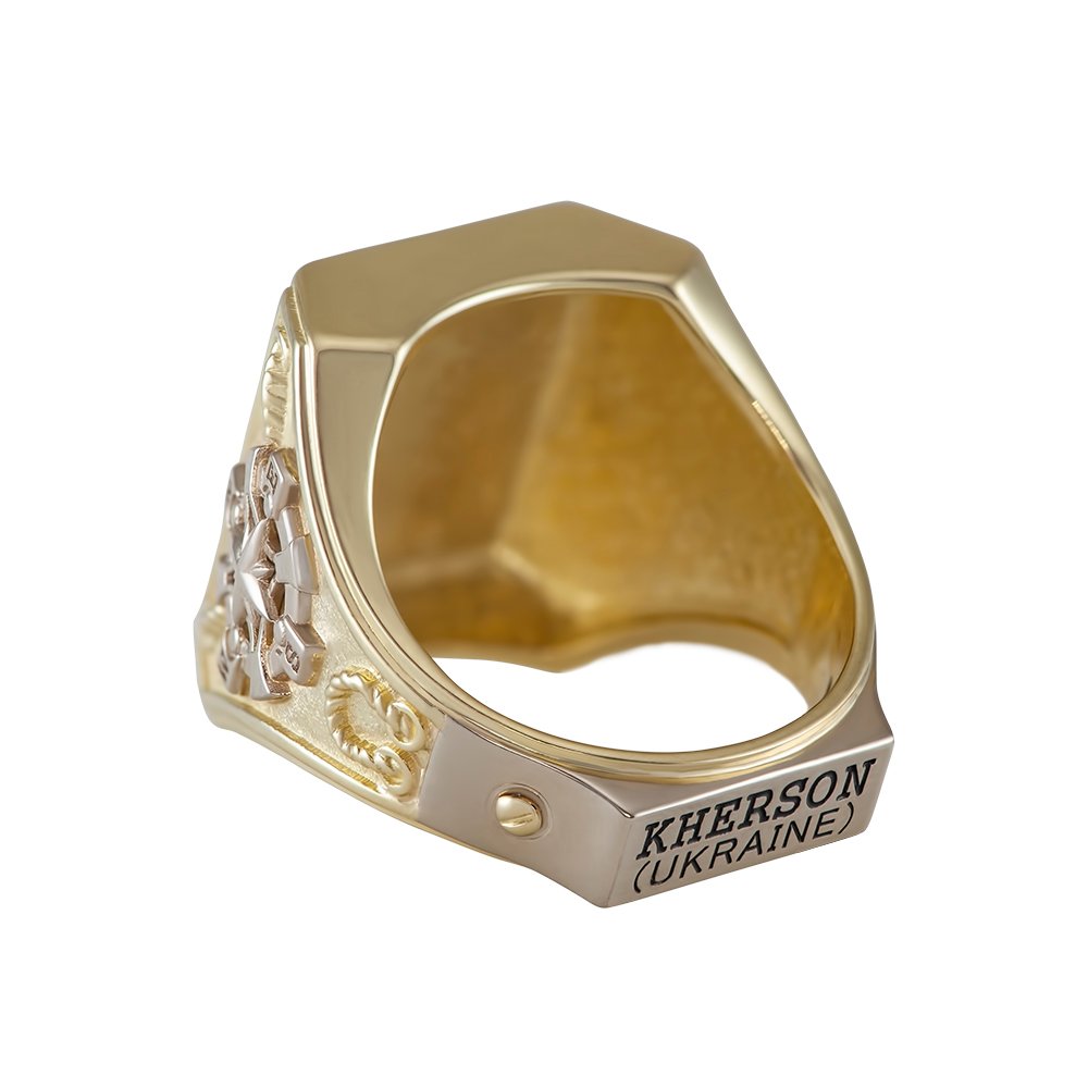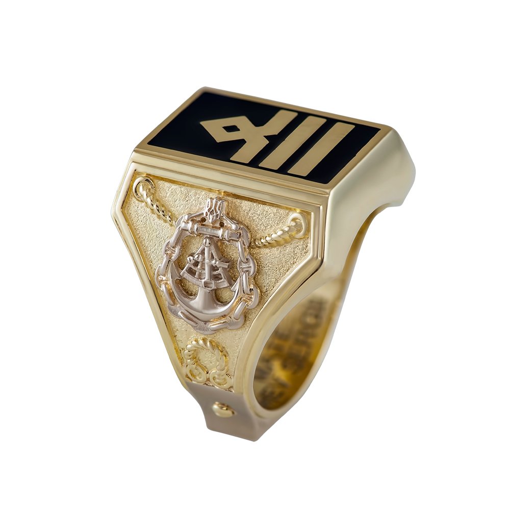 Men’s ring, nautical theme in a combination of lemon and white gold. The weight varies in relation to the size. On the central part, where the image of the epaulet is applied black enamel. On the sides of the overlays the sides of the world and the anchor, also on the bottom part of the overlay of the modeled inscription, which is covered with black enamel. The plates are made of white gold, rhodium plated.