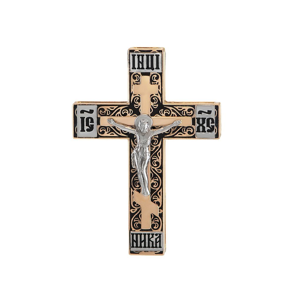 Cross in red gold with white overlays, without ear and side walls, weighing 14.30 grams, the height of the cross 40mm. On the front side of the base with patterns and covered with enamel, also on the base of the inlays in the form of a crucifix and inlays “INCI”, “IS”, “SX”, “NIKA”, which are also covered with black enamel. On the back side of the full text of the prayer “Our Father”, the base is also black enamel.Overlays with white gold covered with rhodium. Between the two bases are spiral shaped lintels.