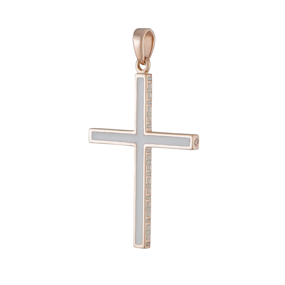 Cross in red gold with white enamel. Weight depends on the dimensions of the jewelry, with the height of the cross without the ear 30mm, the weight of gold 5.79 grams. There are 1.25mm diameter stones (3pcs) on the end of the cross.