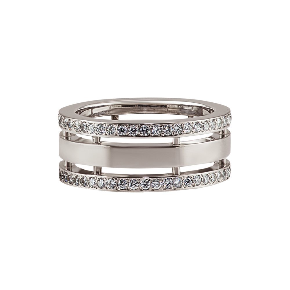 Engagement rings in white gold plated with rhodium. The weight varies according to the size. On the men’s ring, set stones of black color, diameter 2mm, and on the women’s ring colorless stones set on the sides of the diameter of 1.25mm, stones can be set any at the request of the client.