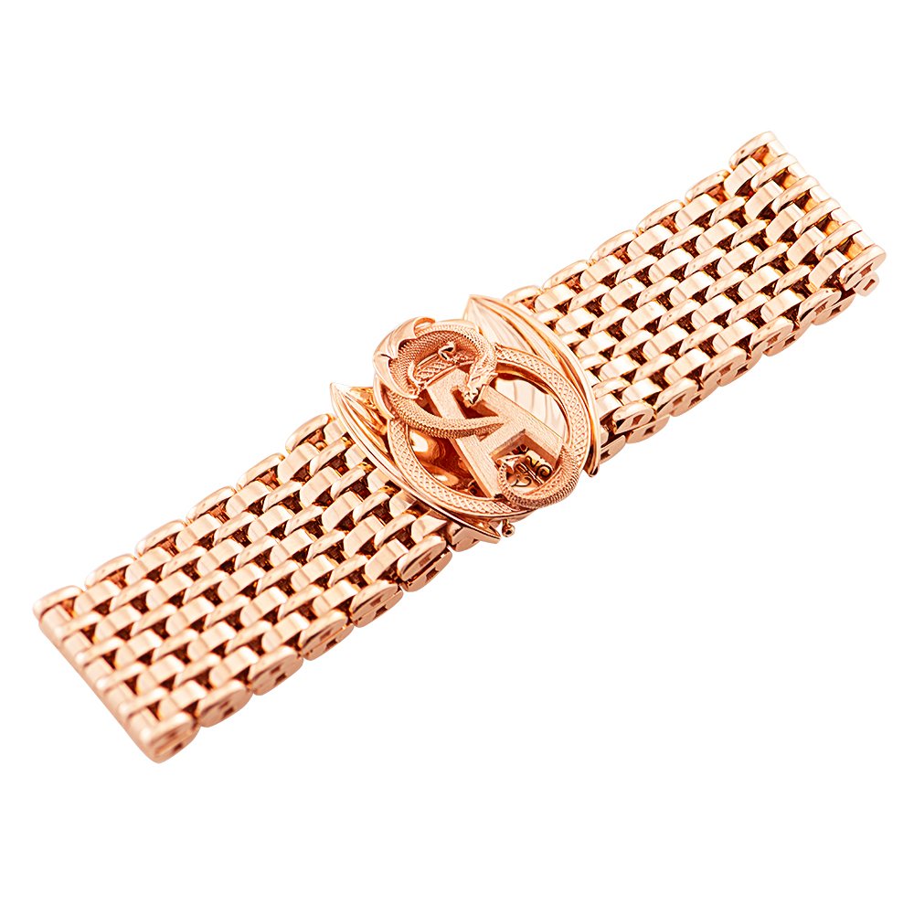 Bracelet in 585* red gold, size 20.7, weight at this size 82.71 grams. On the central part of the convex initials AS with a dragon, on a matte surface. The width of the bracelet is 2cm. The box lock has two dragons and a Yin and Yang sign on the front side, and an Aquarius zodiac sign on the back side. The lock-box on the button.