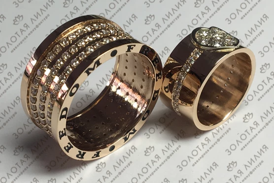 Обручка може бути не схожою на жодну іншу каблучку для заручин. На внутрішній або зовнішній стороні можна вигравіювати унікальний малюнок. Для успішного гравіювання можна використовувати індивідуальний ескіз. Скористайтеся дизайнерськими каблучками на нашому сайті, і ваша друга половинка буде в захваті від подарунка безпрецедентної краси.