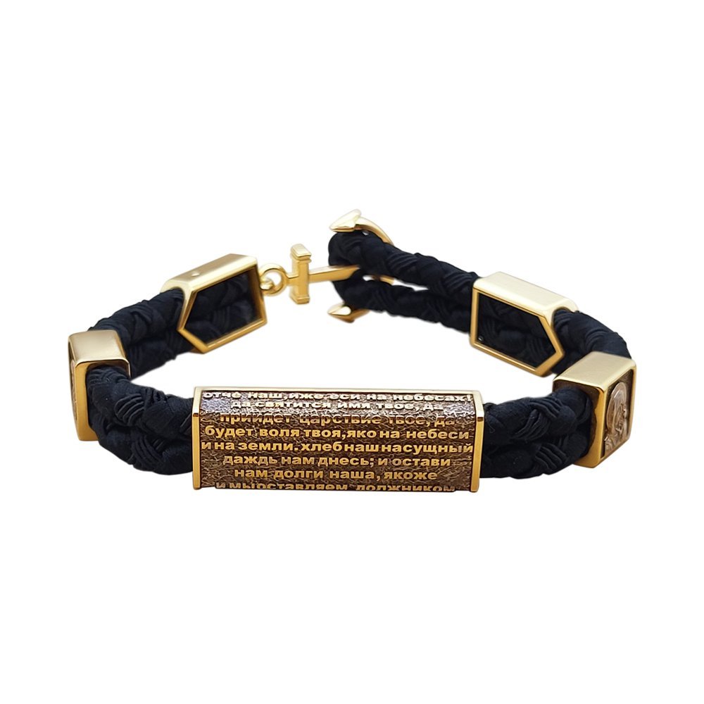 Браслет на шкірі, в лимонному і білому кольорі золота 585*. Замок – вставки якір, який протягується в петлю каната на закінченні. На браслеті вставки з погонами, з ликами Божа Матір і святий Миколай, а також вставка з молитвою "Отче Наш". Канат діаметром 5 мм. Вага золота в браслеті 26 грам. Лики на вставках покриті родієм. Також вставки покриті чорнінням.