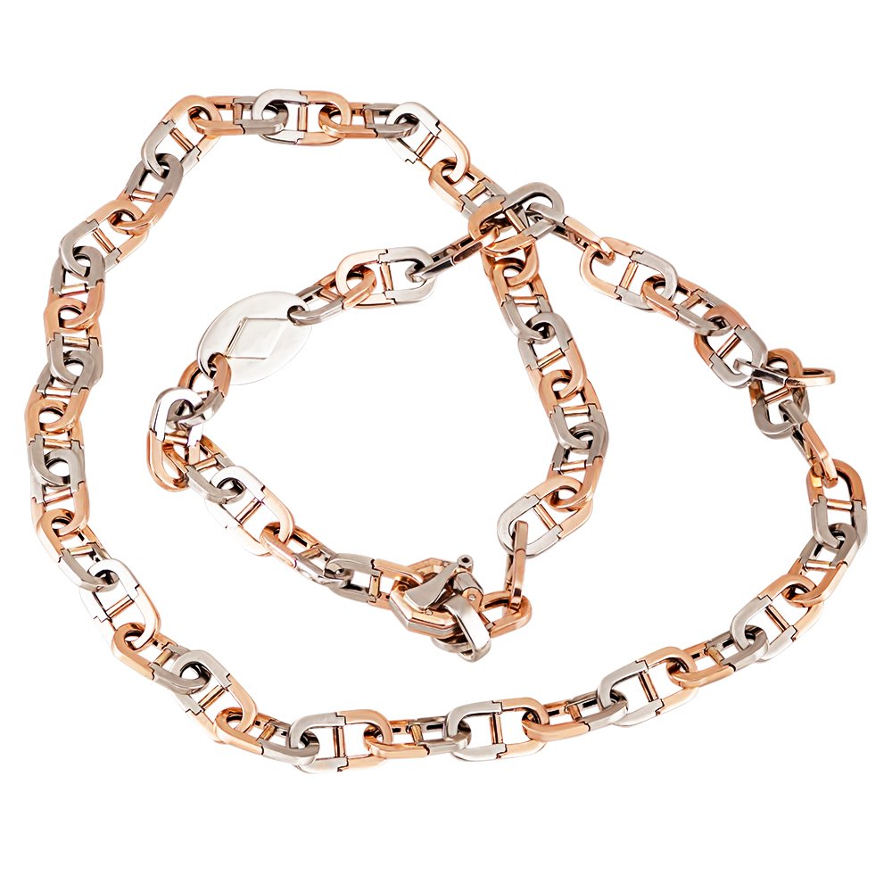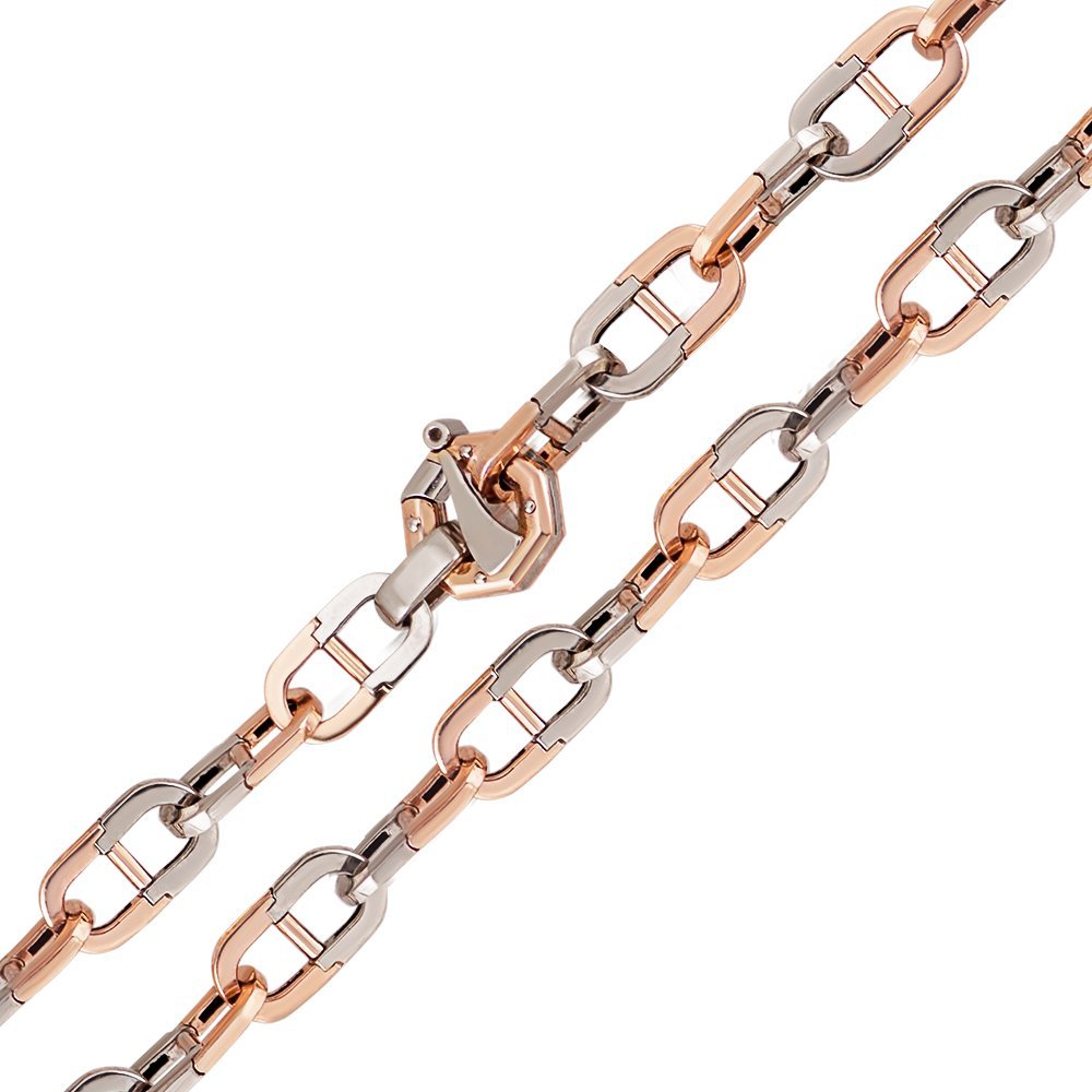 Ланцюг у комбінації червоного і білого золота, летьєва. Ланки чергуються: дві ланки в білому золоті, вкриті родієм, і дві в червоному золоті, на ланцюзі вставка з білого золота. Замок – шестигранний карабін, в комбінованому кольорі білого і червоного золота. Вага змінюється залежно від зміни з розміром. Дизайн можна змінювати за бажанням клієнта.