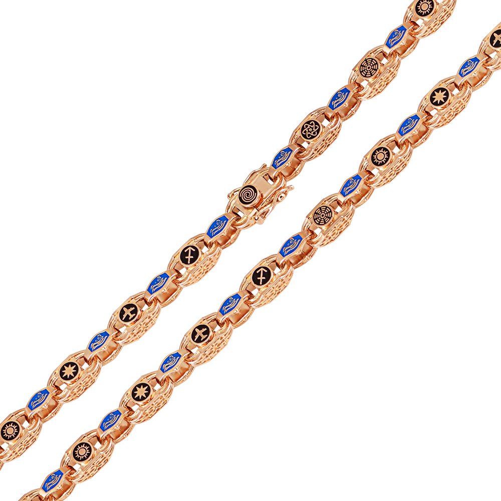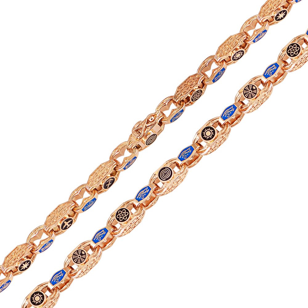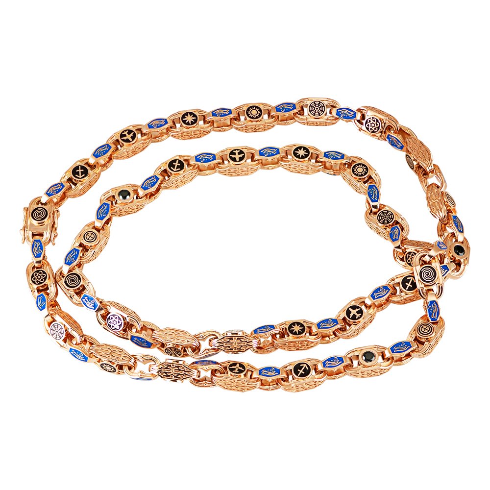 Ланцюг у червоному золоті, вага золота змінюється у співвідношенні довжини. На ланцюгу є вісім елементів і вставка з чорним брилантом, які повторюються. Кожна ланка – це знак з 2-х сторін. Вставки чорні діаманти, діаметром 3.50мм (6шт). Елементи вкриті чорною емаллю, ланки, що з'єднують ланки, синьою емаллю. Замок – коробка має дизайн ланки з двома фіаксаторами.
