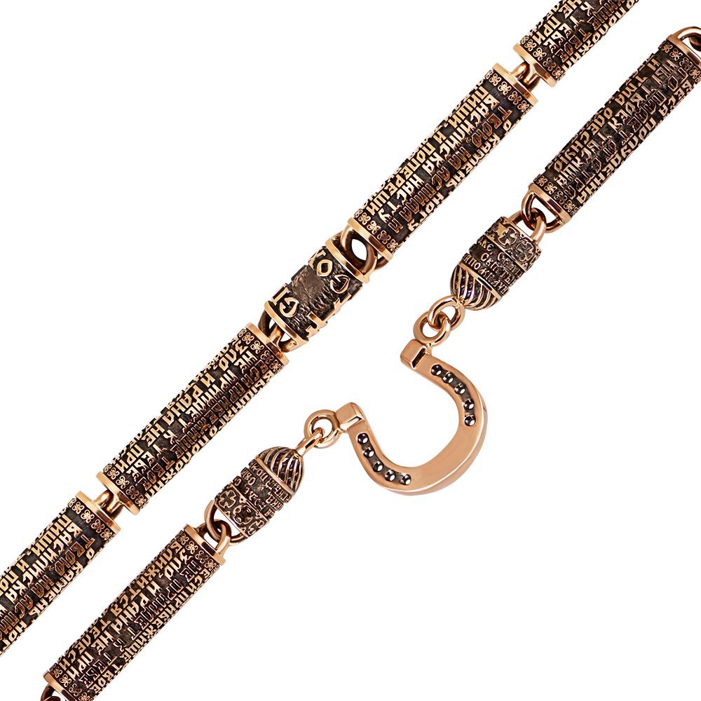 Оригінальний ланцюг, зі вставками молитов із червоного золота. На вставках змодельовані молитви і вставки з написом "Спаси і Збережи", молитви обрані за бажанням клієнта, на кожній вставки покриття чорнінням. З одного боку ланцюга штанга у вигляді підкови, на яку можна одягнути хрест, підвіс або ікону, а з іншого боку замок – коробка з одним фіксатором, що повторює дизайн ланцюга. Вага змінюється залежно від розміру. Дизайн ланцюга можна змінити за бажанням клієнта.