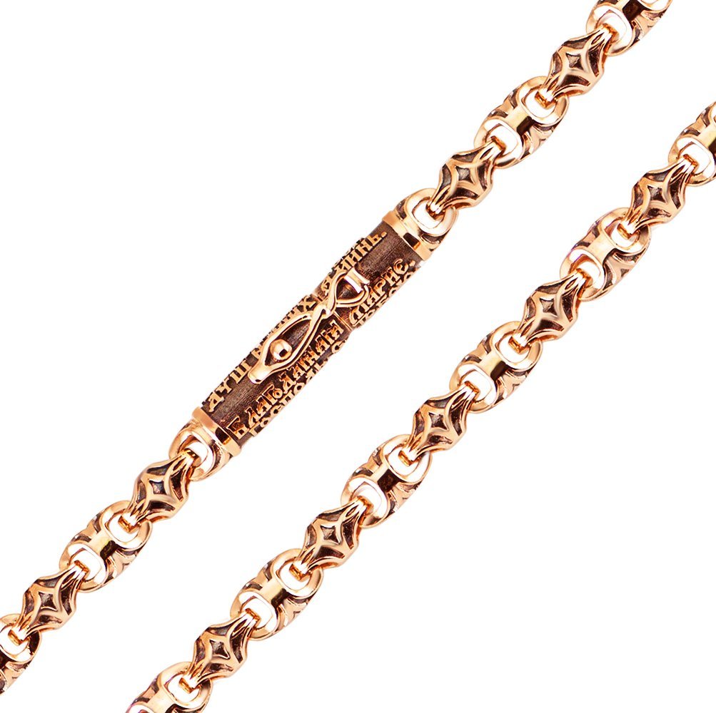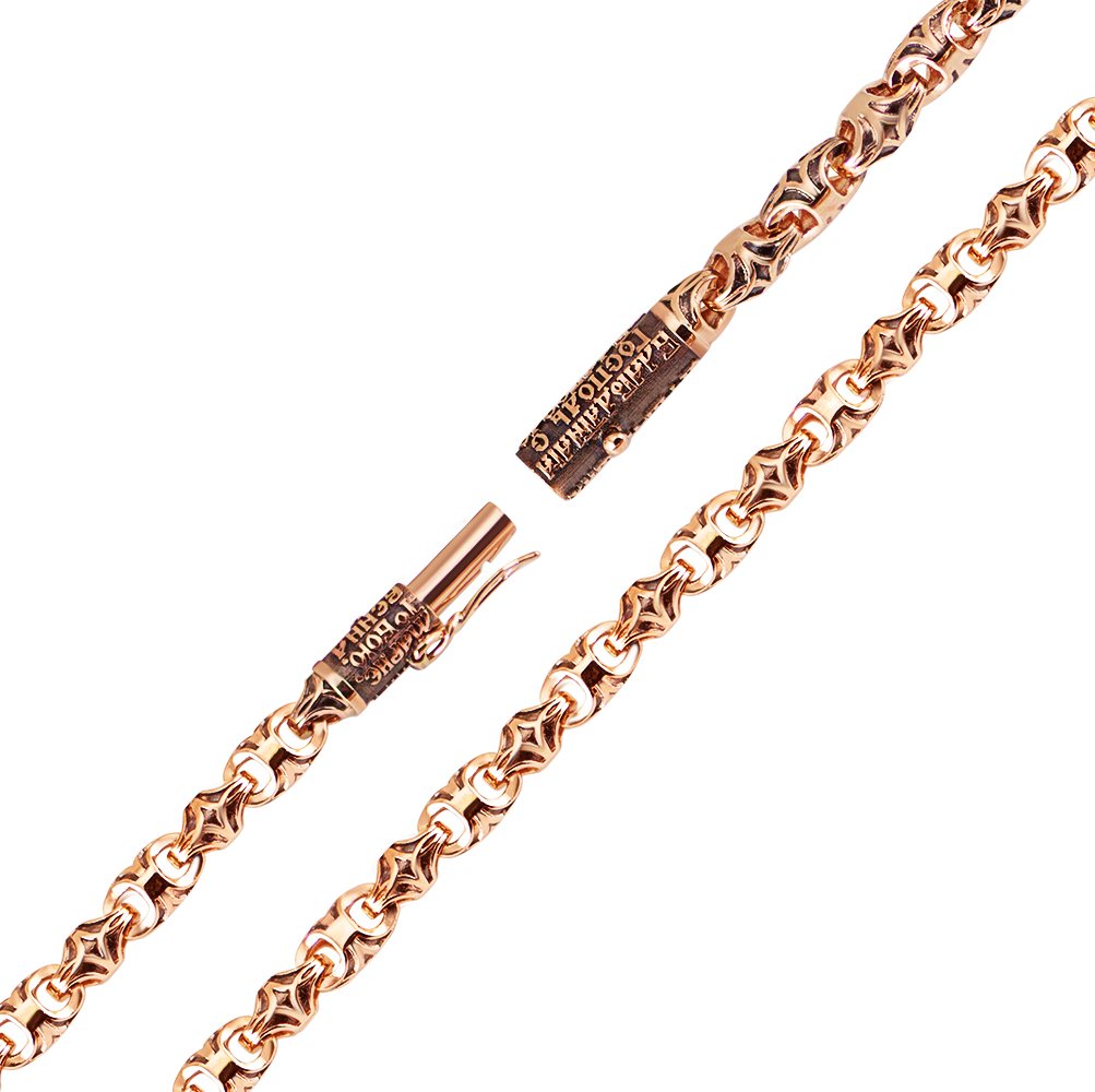 Ланцюг летьєвий, у червоному золоті, зі вставками молитов. Молитви були обрані за бажанням клієнта. На ланках, що з'єднуються, і вставках з молитвами покриття чорніння. Замок – коробка з одним фіксатором, за стилем має дизайн вставки з молитвами. Вага змінюється залежно від розміру. Дизайн можна змінювати за бажанням клієнта.