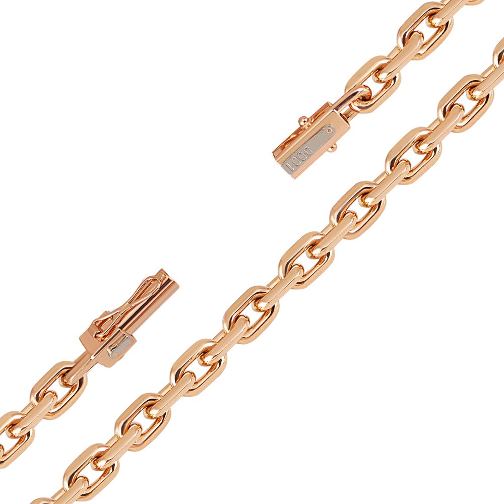 Ланцюг якірного плетіння в червоному золоті. Замок – коробка з двома фіксаторами та накладкою з білого золота, яка покрита родієм. На накладці гравірування "Спаси і Збережи", а з іншого "1000" за бажанням клієнта. Вага золота залежить від розміру в прикрасі. Дизайн прикраси можна змінювати за бажанням клієнта.