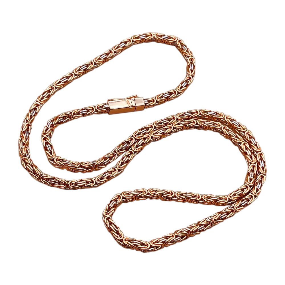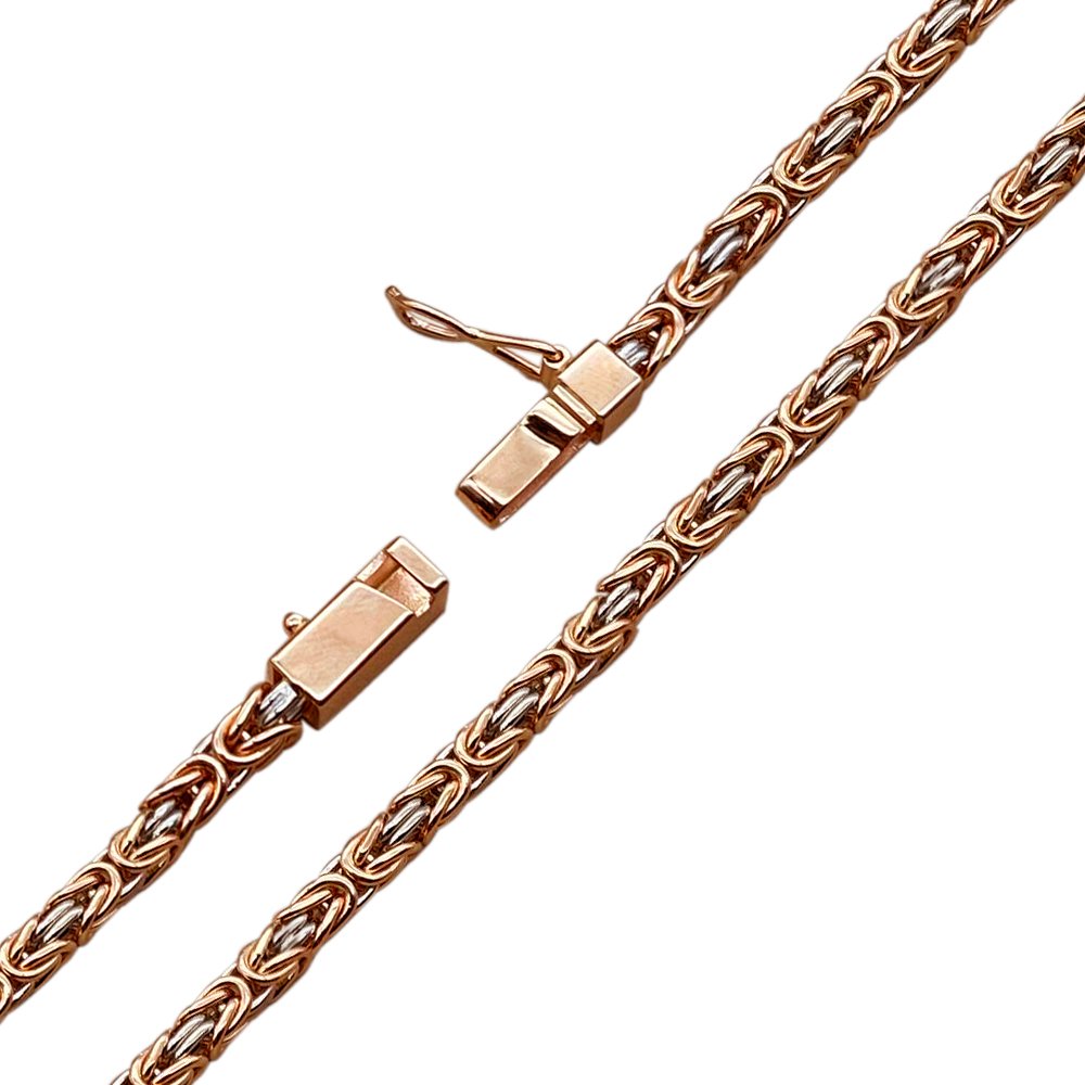 Ланцюг ручного плетіння "Кукурудза", в комбінованому кольорі золота, червоного і білого 585*. Ланки білого кольору покриті родієм. Вага змінюється у співвідношенні довжини. Замок-коробка в одним фіксатором з червоного золота.