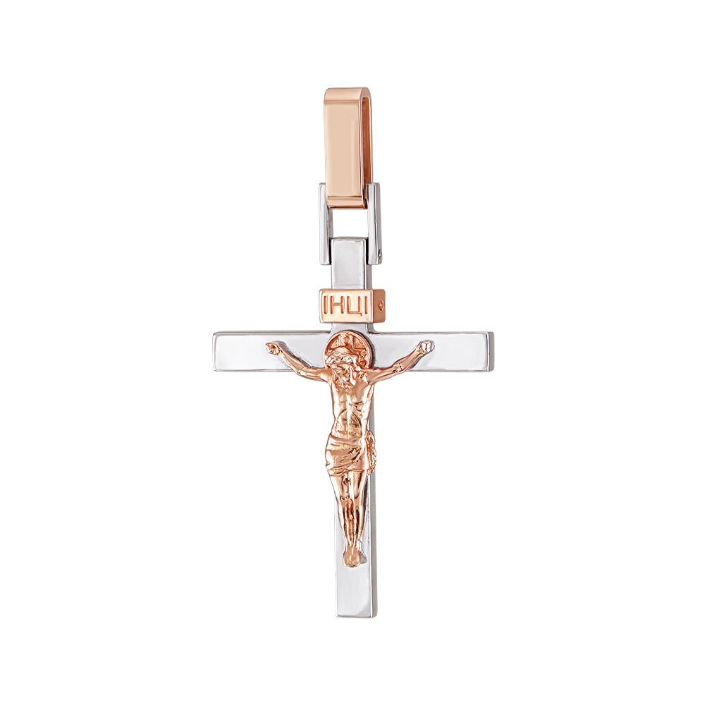 Хрест у білому і червоному кольорі золота. За висоти хреста без вушка 40мм, вага золота 9 грам. Основа в білому золоті, вкрита родієм, накладка розп'яття, "ІНЦІ" і вухо в червоному золоті. З тильного боку на основі змодельований напис "Спаси і Збережи".