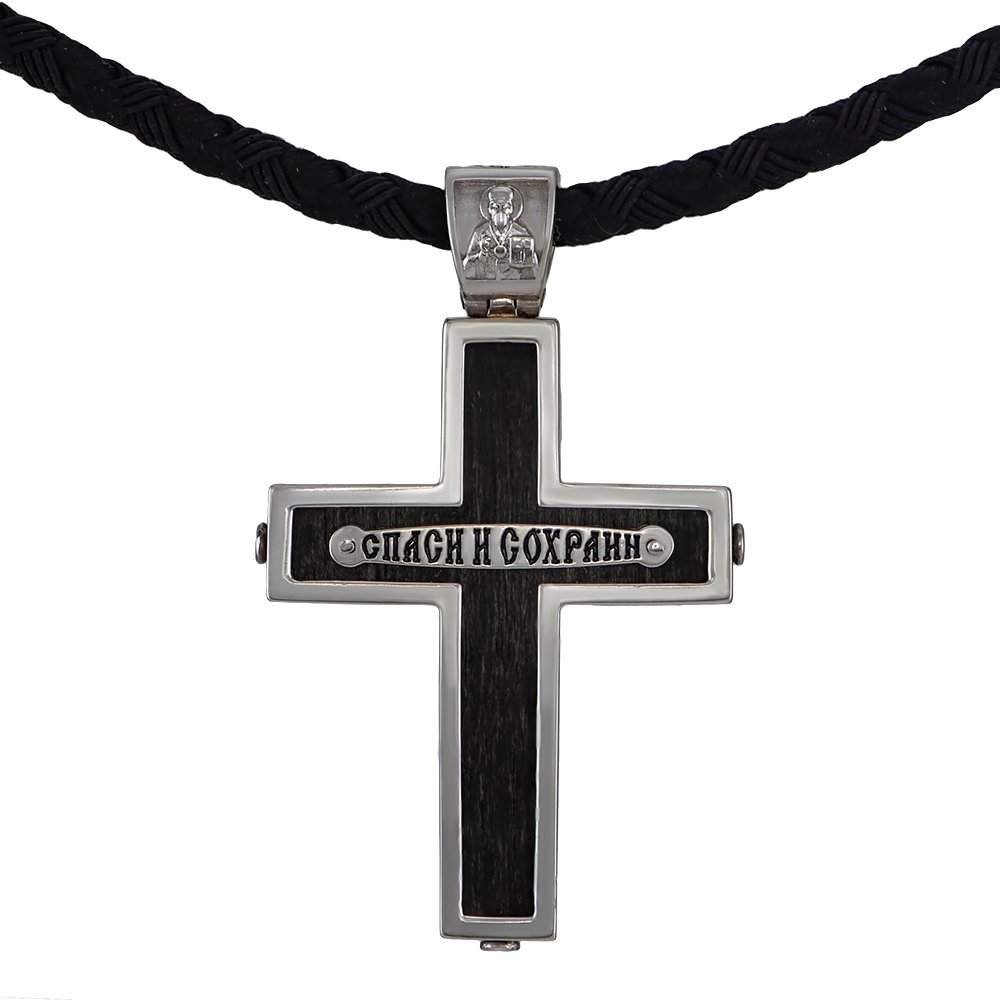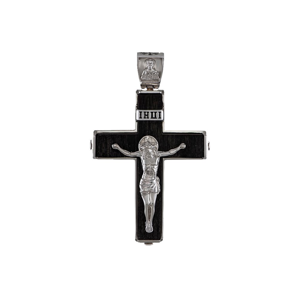 Хрест на дереві Ебен, в білому золоті, вага залежить від габаритів прикраси, за висоти 40мм без вуха, та орієнтовно ширини 30мм вага золота 10 грам. З лицьового боку розп'яття і накладка "ІНЦІ", українською мовою. З тильного боку накладка "Спаси і Збережи". Накладки покриті чорною емаллю. На вушку з лицьового боку і з тильного лик святого. Деталі з білого залота покриті родієм.