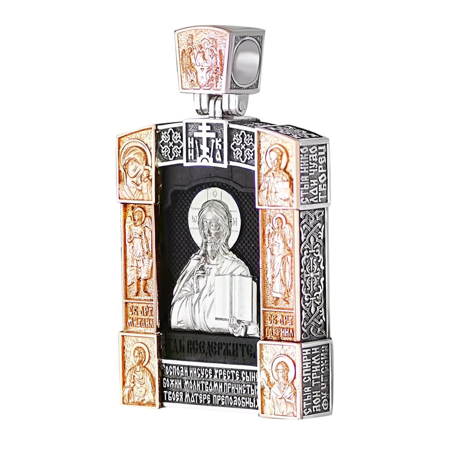 Ікона в комбінації кольорів червоного та білого золота, на дерев'яній основі. Висота ікони без вуха 45мм. З лицьового боку вставки з ликами святих в червоному золоті, вставка по центру Ісуса, молитви і хрестів в білому золоті. з торцевих сторін накладки з найменуваннями святих, і візерунки. З тильного боку повний текст молитви "Отче Наш". На вушку з лицьового боку накладка з червоного золота з ликом Св. Трійці, зі зворотного боку візерунки. Вставки з білого золота покриті родієм. У даній іконі вага золота 51.41 грам.