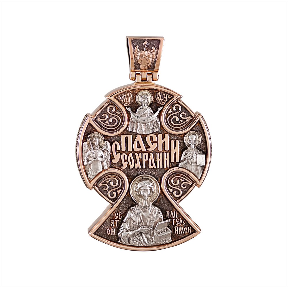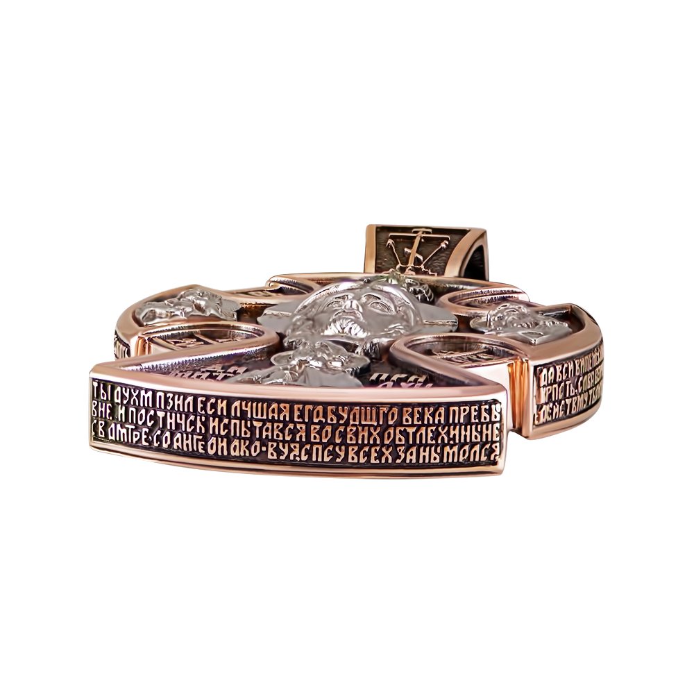 Хрест пустотілий, у червоному золоті з накладками у вигляді образів святих у білому золоті, покриті родієм. Висота з вушком до 70мм, вага при такій висоті 54.80грам. Основа в червоному золоті, по торцях змодельована молитва. На вушку з лицьового боку хрест, з тильного Ангел-охоронець. Хрест покритий чорнінням.