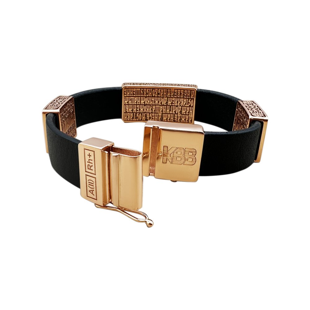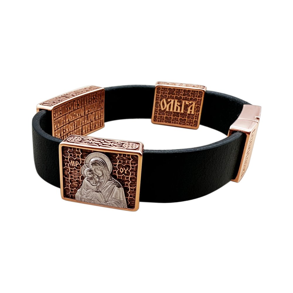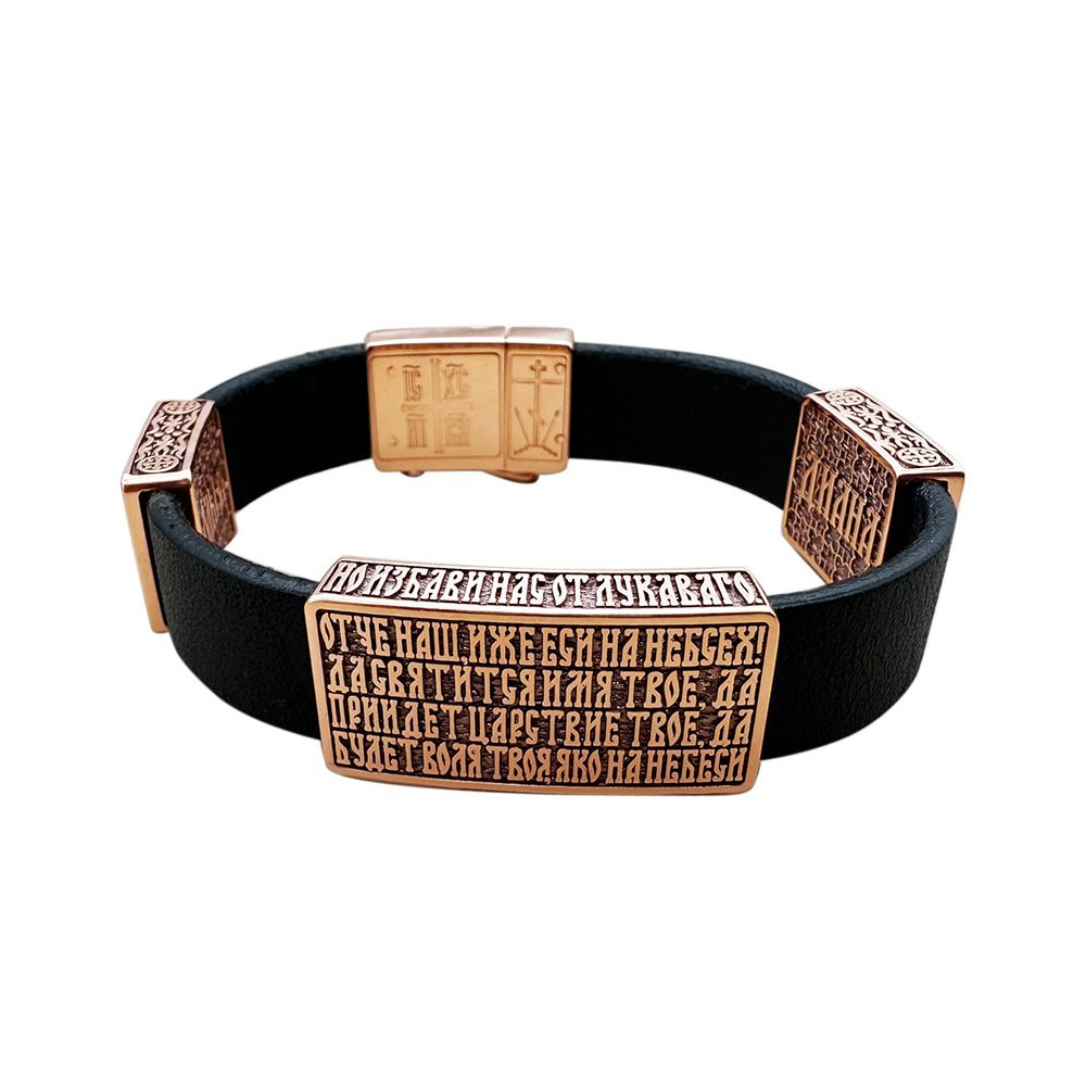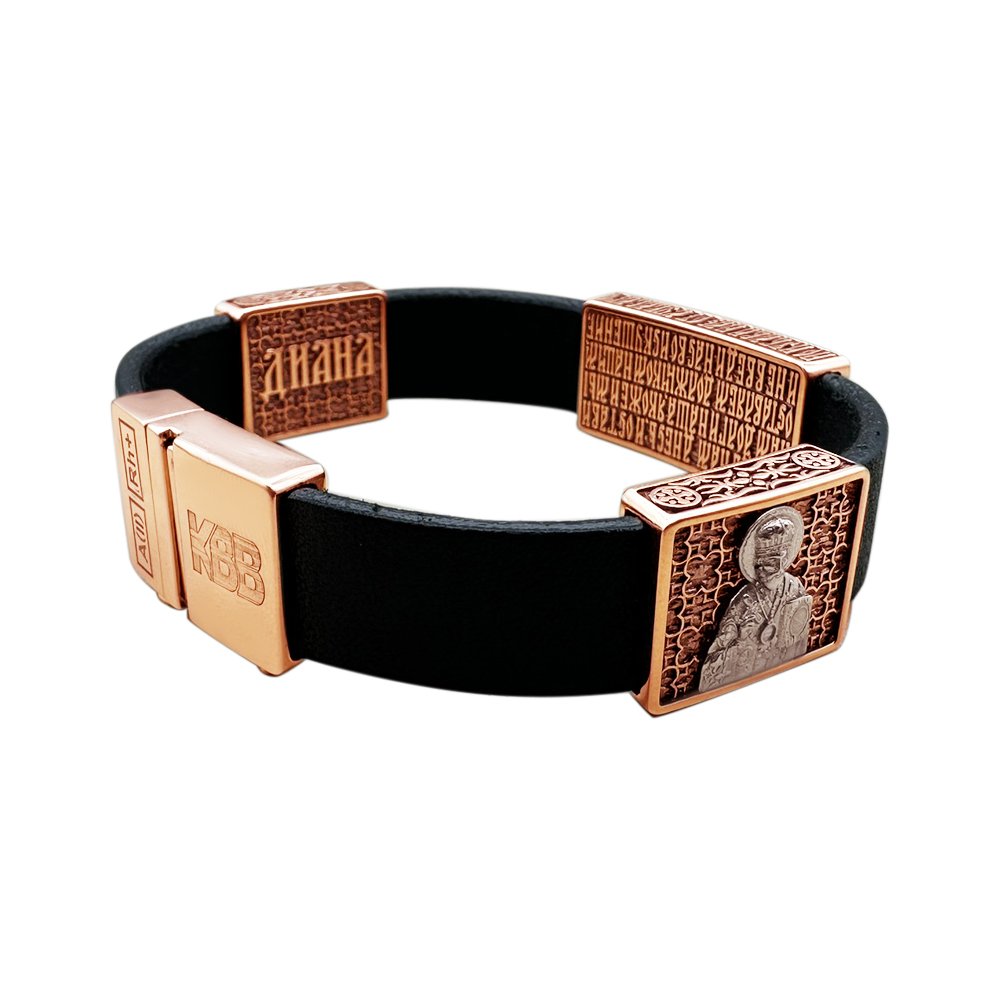 Браслет у червоному кольорі золота на шкірі. Центральна вставка з молитвою "Отче Наш", на бічних вставках образ Святого Миколая та Божої Матері, у вигляді накладок з білого золота, що вкриті родієм, на звороті бічних вставок імена, за бажанням клієнта. Замок – коробка з персоналізацією та з одним фіксатором. Вага залежить від кількості вставок та їх діаметра. За ширини шкіри 14.2 мм, вага золота в прикрасі 47.47 грам, розмір браслета 21 грам. Дизайн можна змінювати за бажанням клієнта.