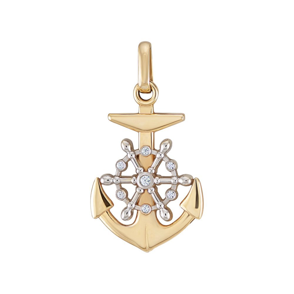 Підвіс у лимонному та білому кольорі золота 585*. Вага золота в підвісі від 4 грамів. Якір у лимонному золоті, штурвал у білому золоті. По штурвалу встановлено каміння діаметром приблизно 1мм (6шт); 1.25мм. Висота підвісу бех вуха 25мм. Штурвал покритий родієм.