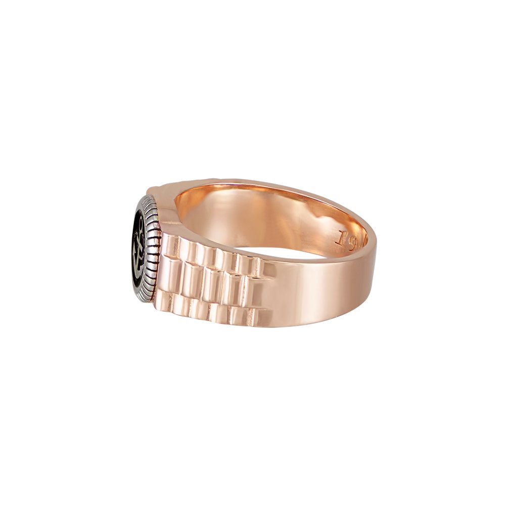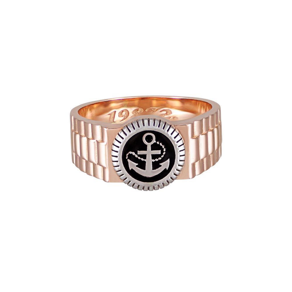 Чоловіча каблучка основа в червоному, накладки в білому золоті. Вага золота залежить від розміру прикраси. Центральна частина – коло і якір у білому золоті, покритий родієм. Навколо якоря покладена чорна емаль.