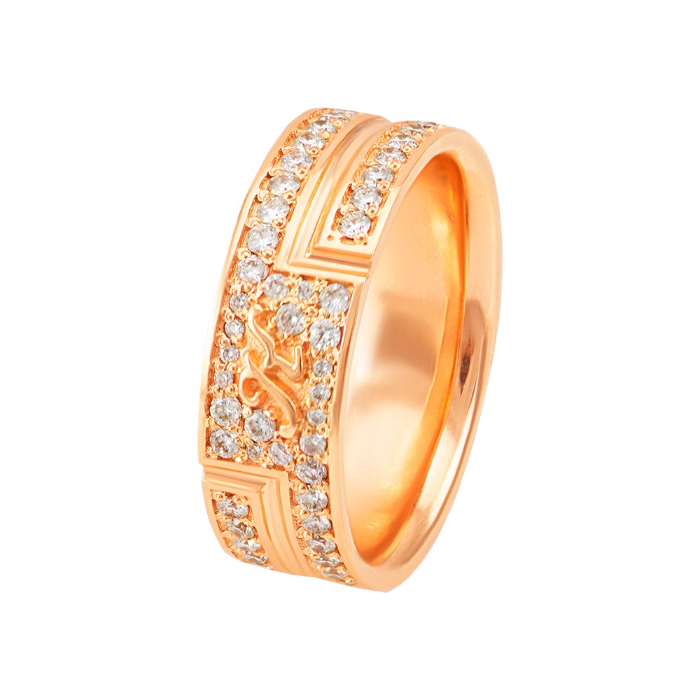 Каблучка в червоному золоті 585*, ширина каблучки 6-7мм. При розмірі 19, вага золота 6.26 грам. Камені діаманти 1.5мм – 78шт, 1.25мм – 3шт, 1мм – 9шт.