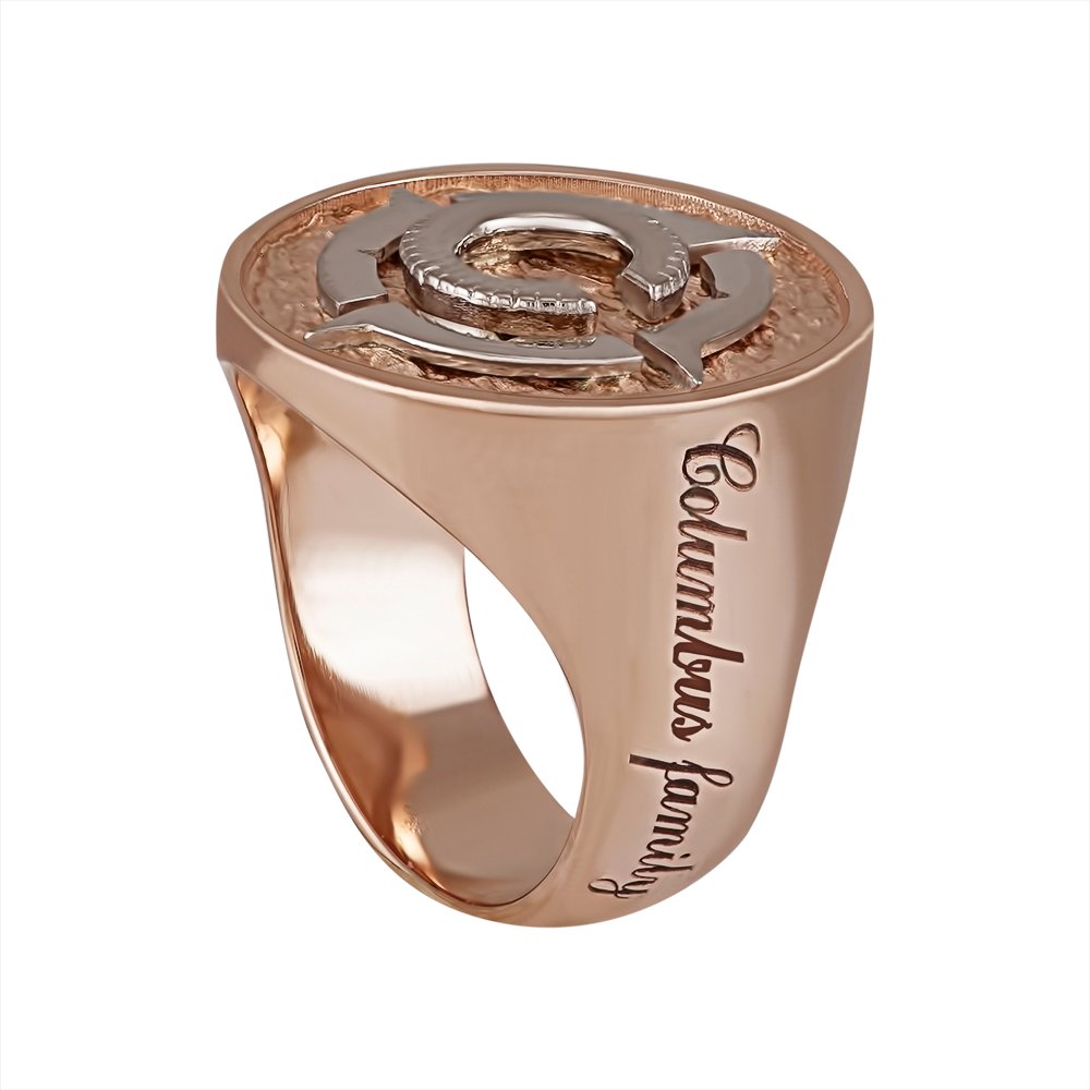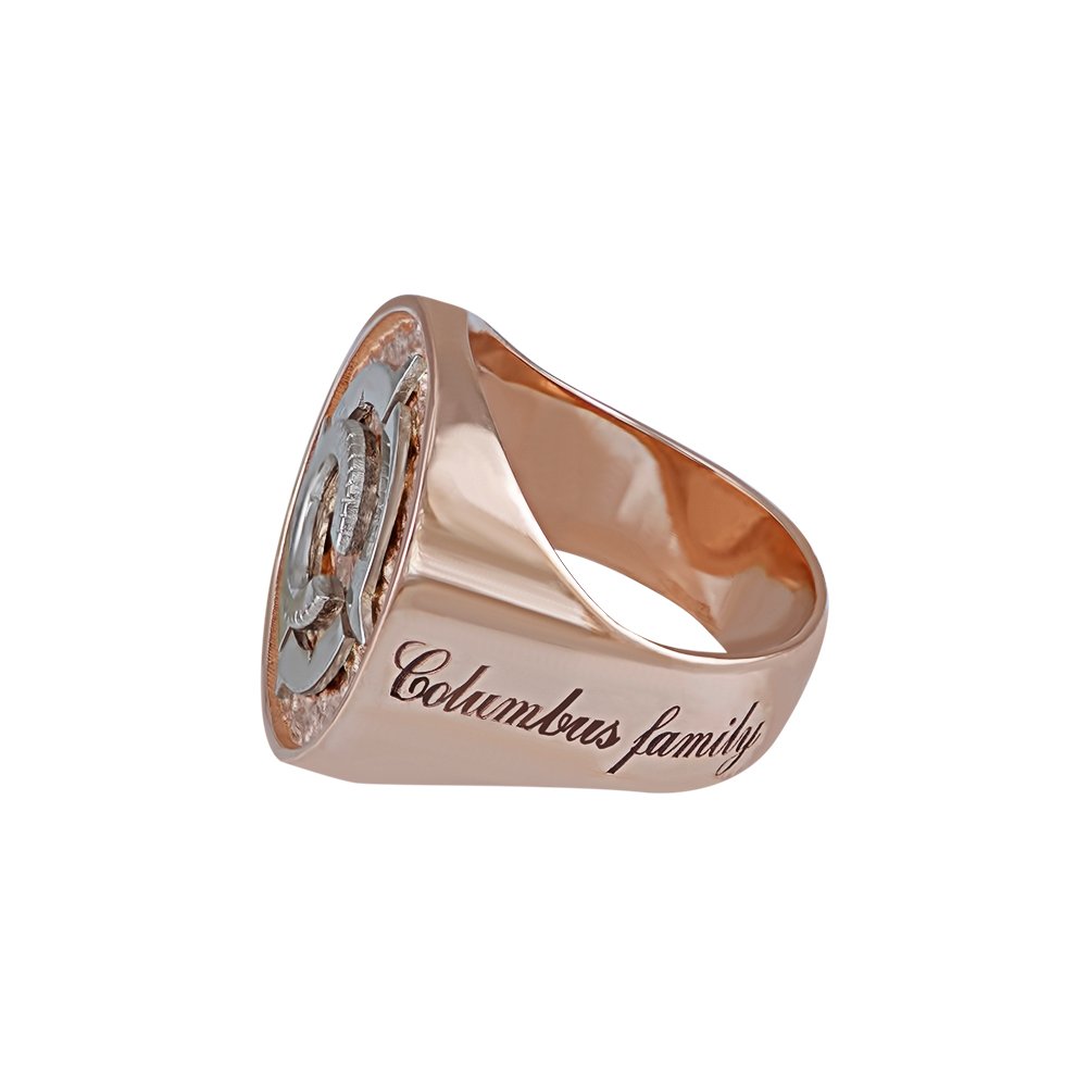 Чоловіча каблучка в червоному кольорі золота і накладкою з білого золота покритою родієм. Вага змінюється відповідно до розміру. З лицьового боку по центру накладка з логотипом у білому кольорі золота. З боків змодельований напис "Columbus family", який вкритий чорнінням.