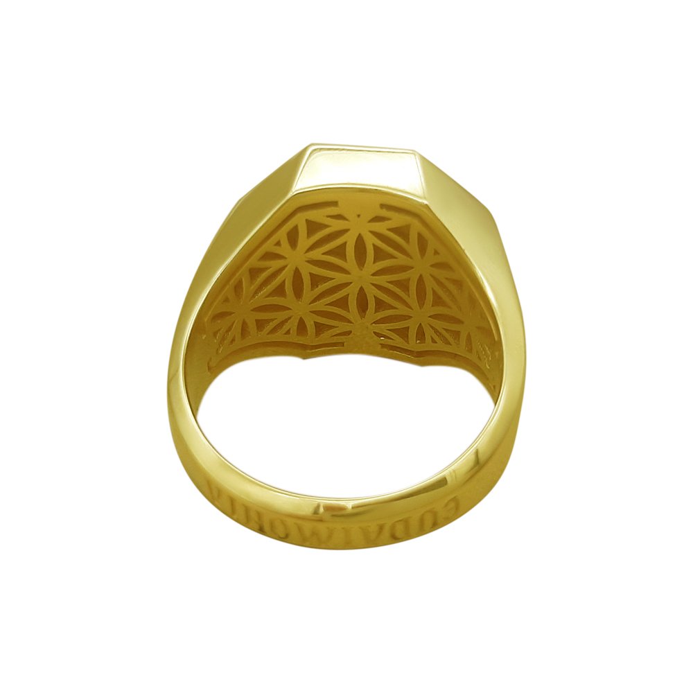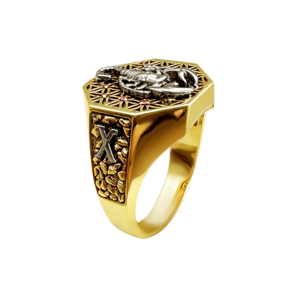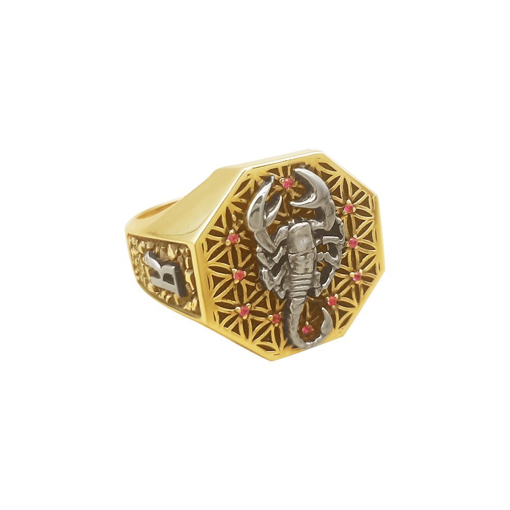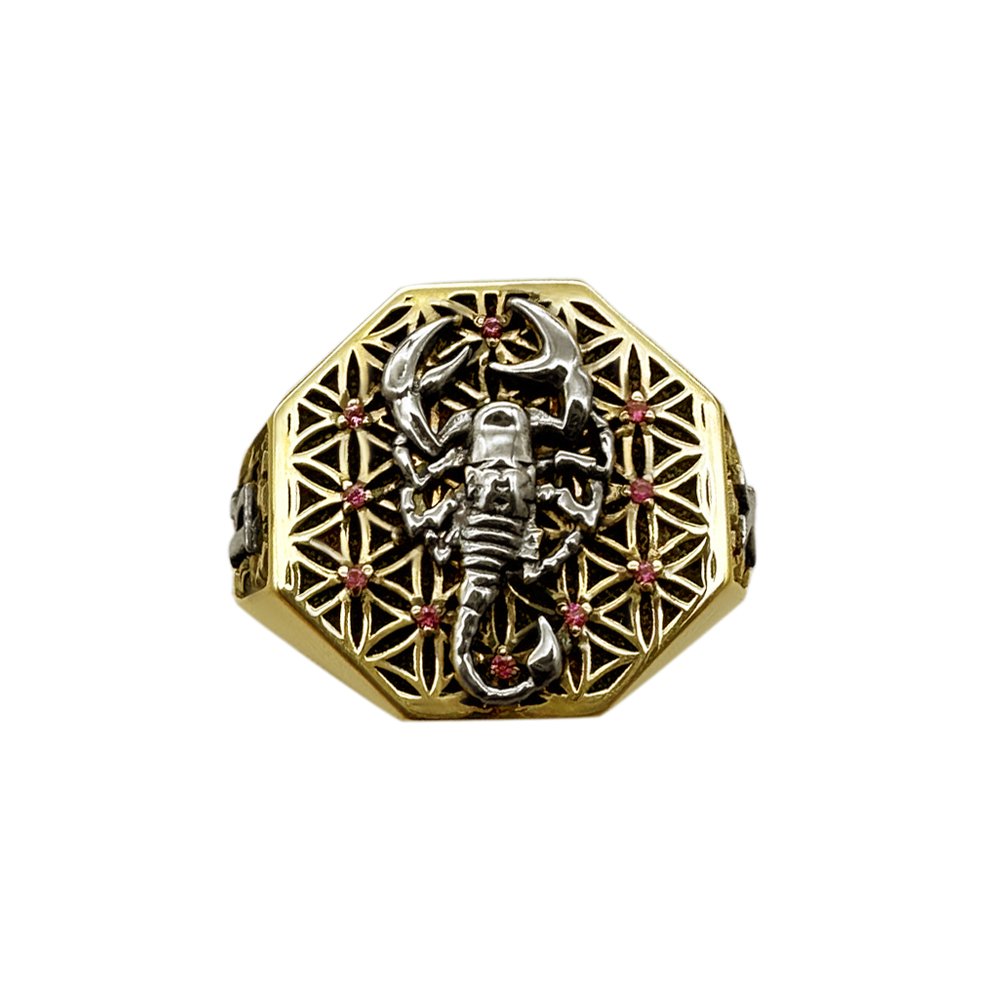 Печатка в лимонному кольорі золота, пробою 585*, вага змінюється відповідно до розміру. Усередині майданчика малюнок квітки життя з рубінами, діаметром 1мм. Зверху квітки у вигляді накладки скорпіон у білому кольорі золота, покритий родієм. З боків малюнок – імітація каменів та ініціали клієнта у вигляді накладок. Ініціали в білому золоті, покриті родієм. По шинці дата і напис за бажанням клієнта.