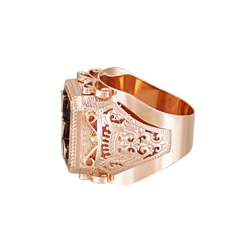 Чоловіча каблучка в червоному золоті. Вага змінюється у співвідношенні розміру. На центральній частині площа з ініціалами клієнта, під ініціалами розміщена чорна емаль. З боків накладки з візерунками.