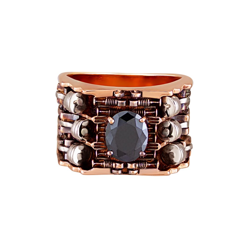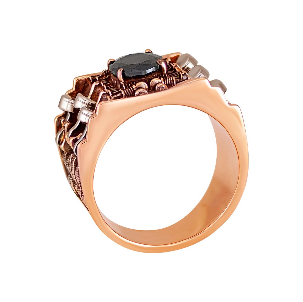 Чоловіча каблучка в комбінації кольорів золота, червоного і білого, вага змінюється у співвідношенні з розміром. По центру встановлений чорний фіаніт, формою овал. З боків накладки поршнів у білому золоті, покриті родієм. Сама печатка створює загальну композицію механізму. Чоловіча каблучка вкрита чорнінням.