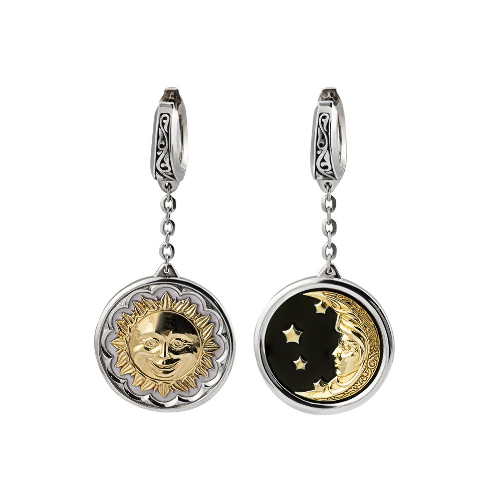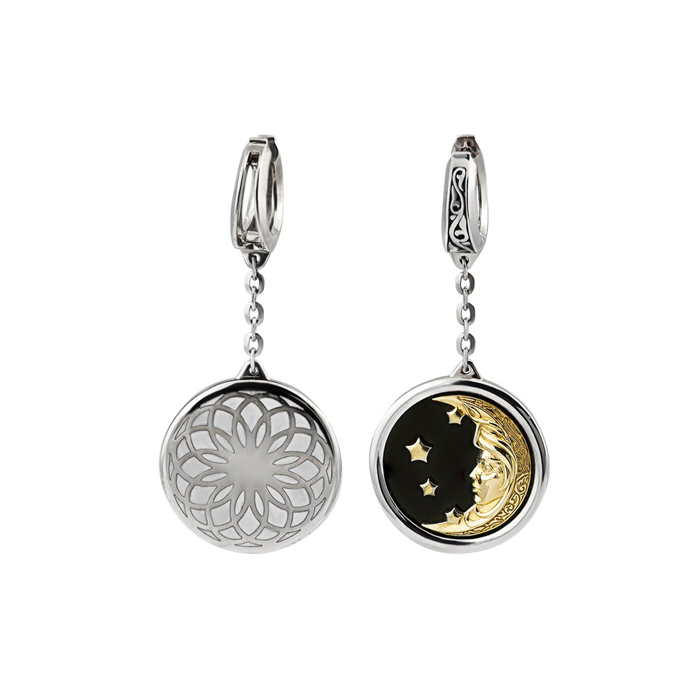 Сережки в лимонному і білому золоті 585*, вага золота в парі від 19 грам. На сережках зображення сонця і місяця із зірками. Місяць із зірками і сонце в лимонному золоті, основа в білому. Сережки з місяцем і зірками з чорною емаллю. Загальна довжина сережок 55 мм. Біле золото родоване.
