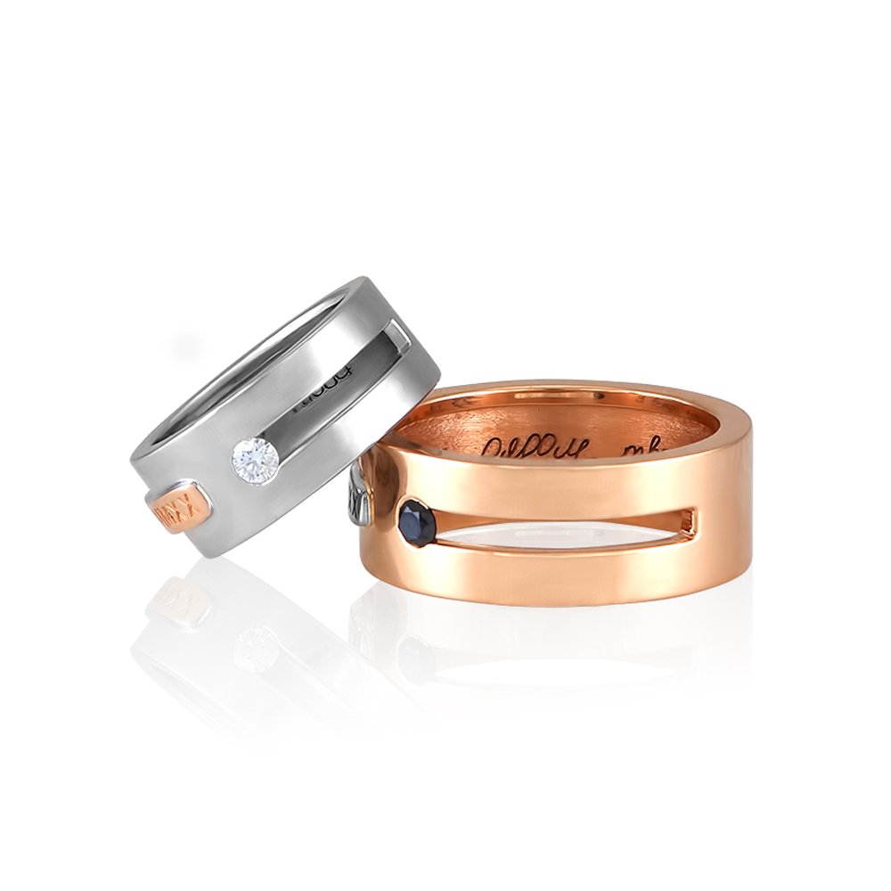 Обручки в комбінованому кольорі золота. Жіноча каблучка основа в білому золоті, накладка на каблучки в червоному золоті. Чоловіча каблучка основа в червоному золоті, накладка в білому холоті. На накладках дати римською. На чоловічій каблучці вставка каменю, діаметром 3.25мм чорного кольору, на жіночій камінь безбарвний, діаметром 2.75мм. Товщина каблучок 1.5 мм. Деталі з білого золота покриті родієм. Усередині каблучок гравіювання, за бажанням клієнта. Можна встановити будь-яке каміння, за бажанням клієнта. Вага знаходиться відповідно до розміру.