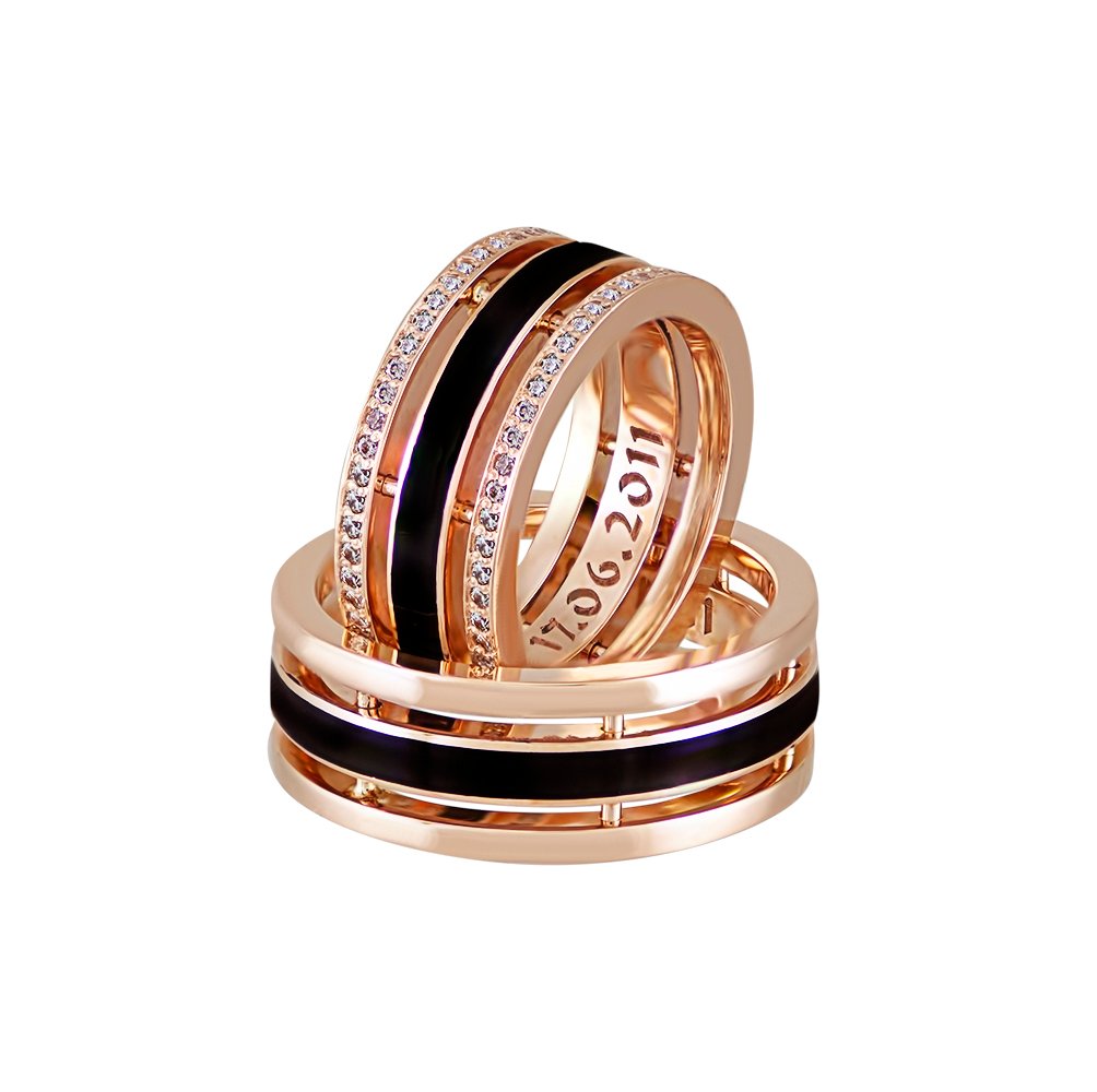 Обручки в червоному золоті з чорною емаллю. Вага залежить від розміру каблучок. На лицьовій стороні по шкідливій лінії розташована чорна емаль. Чоловіча каблучка гладенька, а на жіночій по бортах розташований розсип каміння, діаметром орієнтовно 1.50мм. У внутрішній частині, по середній лінії змодельована дата, яка покрита чорнінням. Ширина каблучок орієнтовно 7мм.
