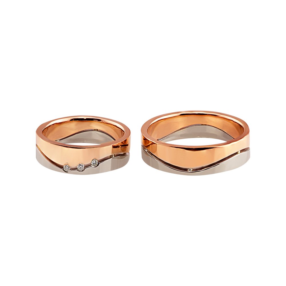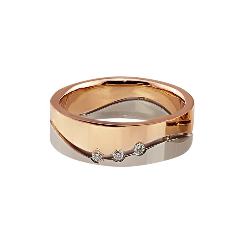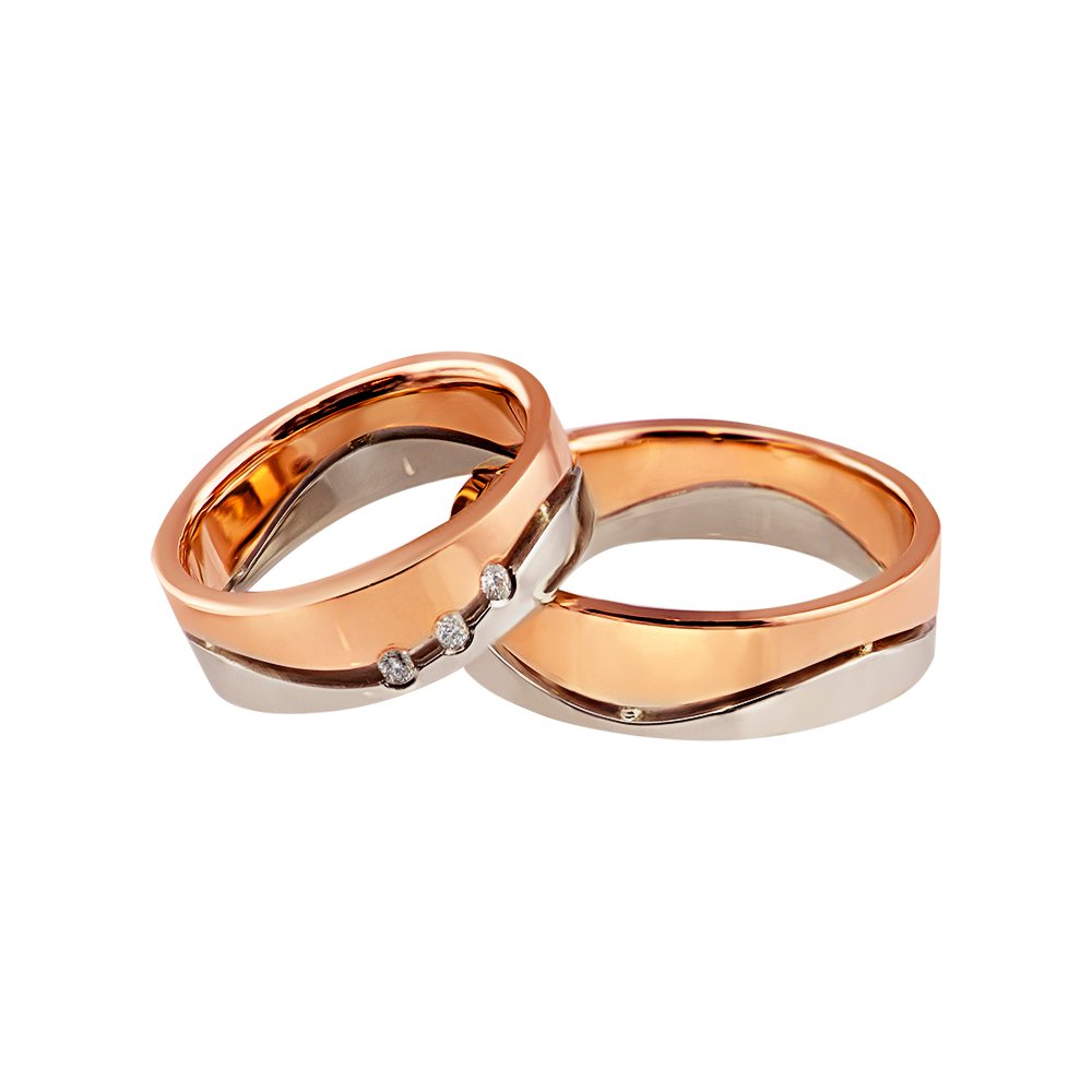 Обручки в червоному і білому кольорі золота, проба 585*. Ширина каблучок 6мм. Камені на жіночому 3 штуки, діаметром 1.5 мм, діаманти.